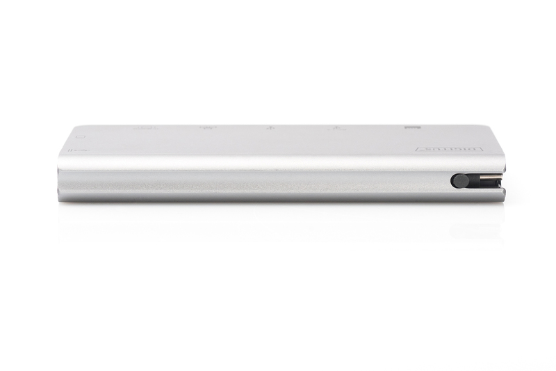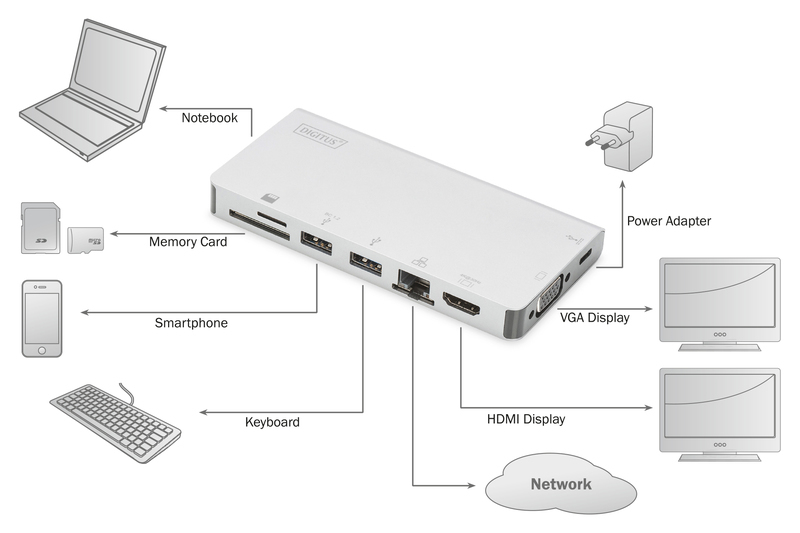 Dzięki wieloportowej podróżnej stacji dokującej marki Digitus masz wszystkie najważniejsze złącza zawsze przy sobie. Stacja dokująca rozbudowuje notebook o osiem dalszych portów. Posiada dwa porty wideo (HDMI i VGA). Obsługa najwyższych możliwych rozdzielczości (HDMI): UHD o znakomitej jakości obrazu (4K2K/30 Hz). Stacja dokująca posiada poza tym dwa porty USB 3.0, z których jeden dysponuje funkcją ładowania urządzeń przenośnych (BC 1.2). Posiada ona również port USB-C (ładowanie 3.0 + transmisja danych). Przyłącze Gigabit Ethernet umożliwia podłączenie notebooka do sieci również za pomocą kabla. Całość uzupełniają dwa czytniki kart (MicroSD, SDHC, SDXC / MMC). Dzięki kompaktowym wymiarom, niewielkiej wadze oraz możliwości schowania kabla przyłączeniowego wieloportowa stacja podróżna jest idealnym urządzeniem do wykorzystania w podróży.