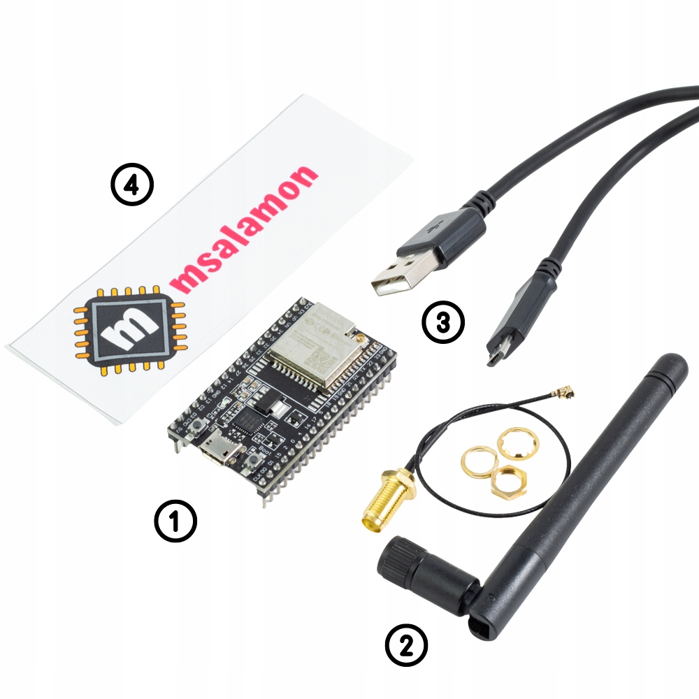 W zestawie znajduje się: Płytka z modułem ESP-WROOM-32U, zewnętrzna antena, przewód USB micro, naklejka.