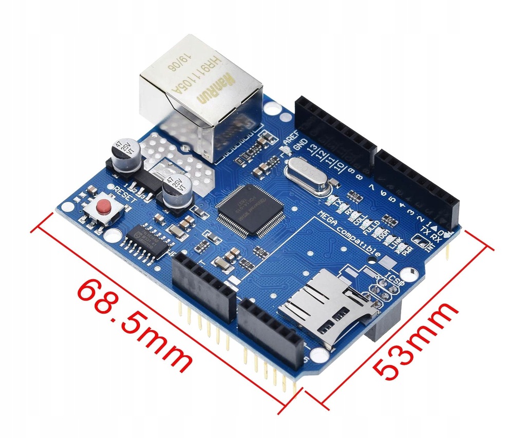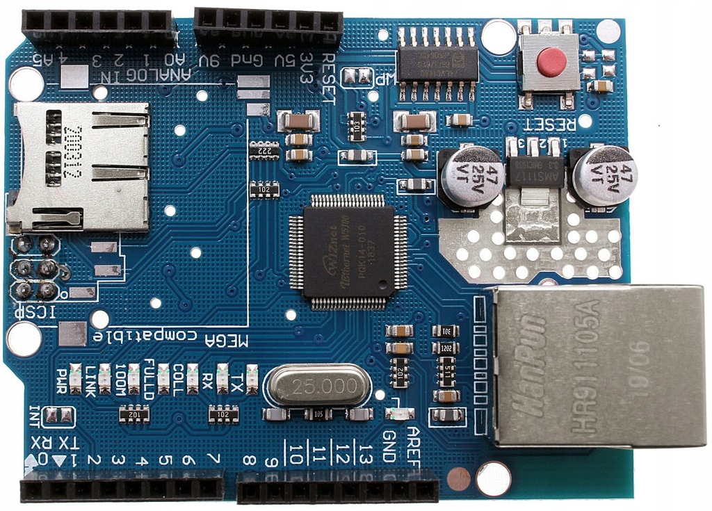 Wykorzystywany jest jako rozszerzenie sprzętowe dla Arduino Uno, Mega2560 itp - umożliwia w łatwy sposób na podłączenie do sieci LAN i przesyłanie danych