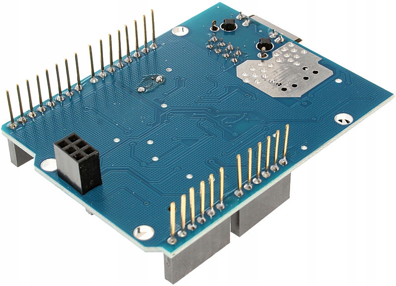 Długość pinów w Shieldzie nie jest przypadkowa - zwróć uwagę podczas montażu, aby dolne piny Gniazda LAN ( miejsce ich lutowania ) nie stykały się z Gniazdem USB Arduino Uno / Mega - zalecamy skrócić wystające piny oraz odizolować je np. taśmą izolacyjną.