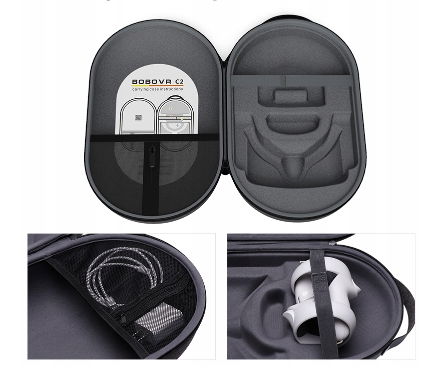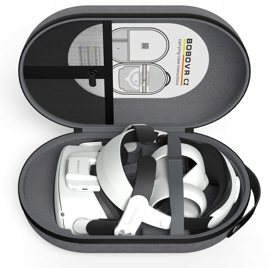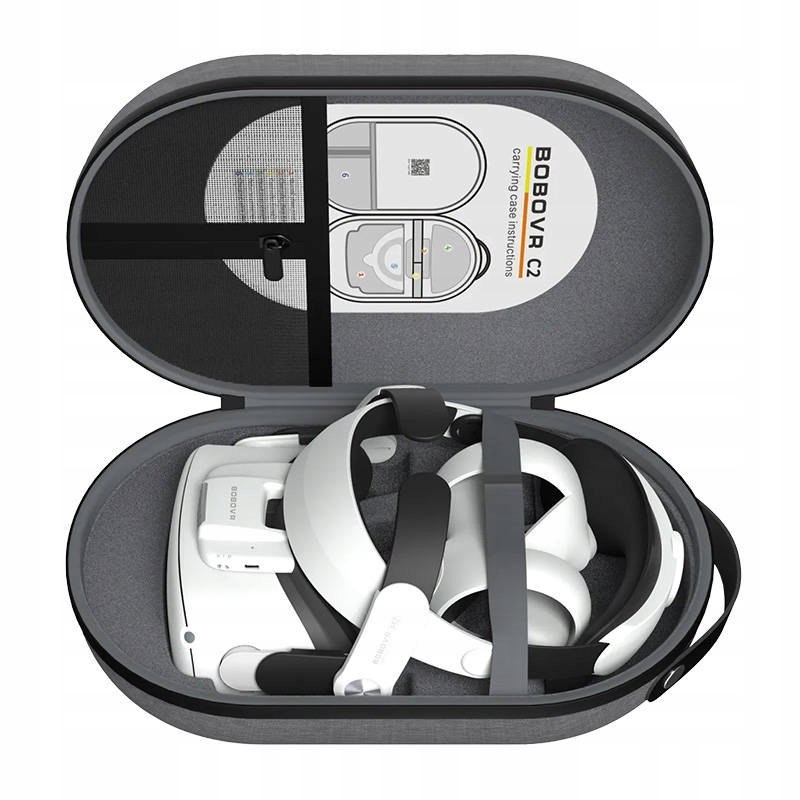 Przemyślana konstrukcja etui sprawia, że z łatwością zmieścisz w nim niezbędne elementy swojego zestawu VR. Gogle VR, akumulator, kontroler z paskiem mocującym, pasek na głowę oraz kable - w etui C2 wszystko masz pod ręką.