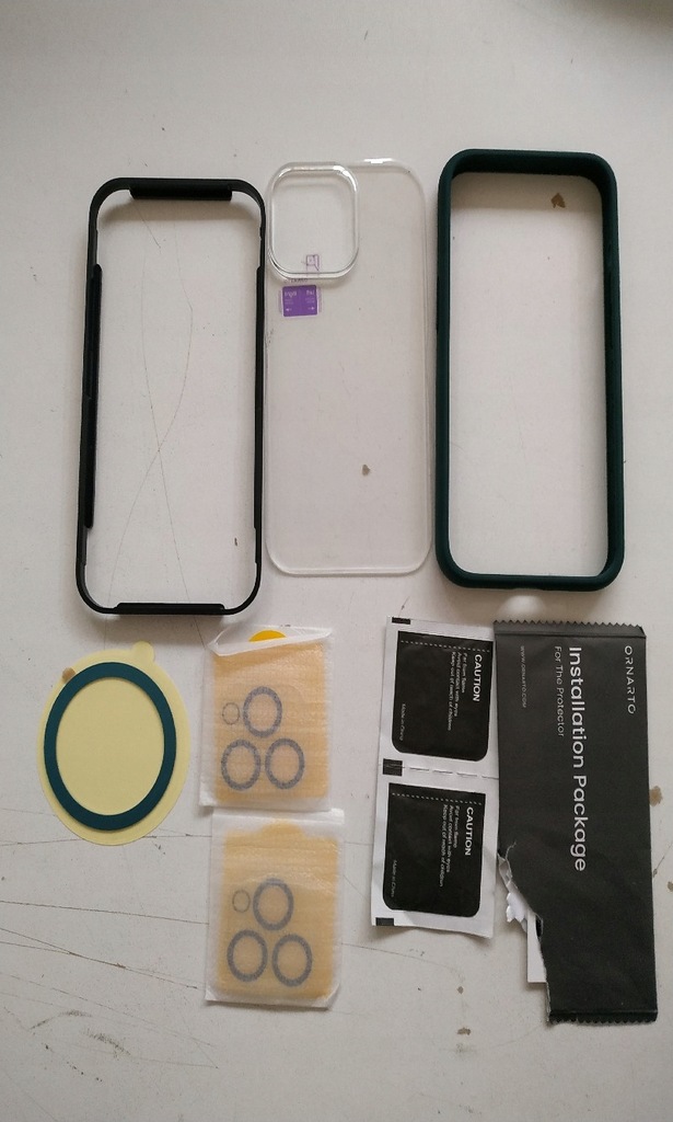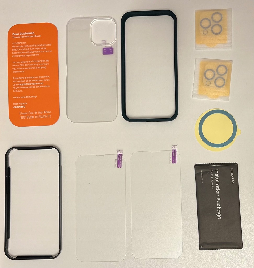 W zestawie ramka, silikonowa ramka, szkło na tył, 2x szkło na aparat, magsafe ring, akcesoria montażowe