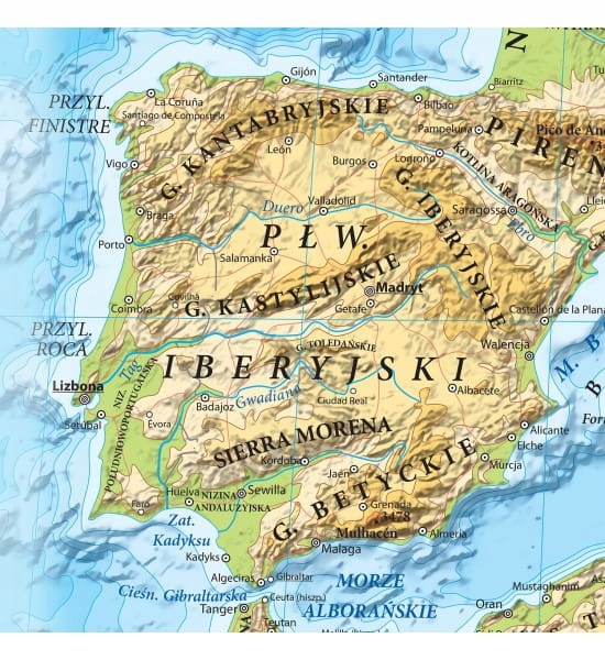 Fizyczna mapa ścienna Europy w skali 1:4 500 000 wydawnictwa Eko-Graf. Mapa z cieniowaną rzeźbą terenu, przyjazną kolorystyką i czytelną grafiką.