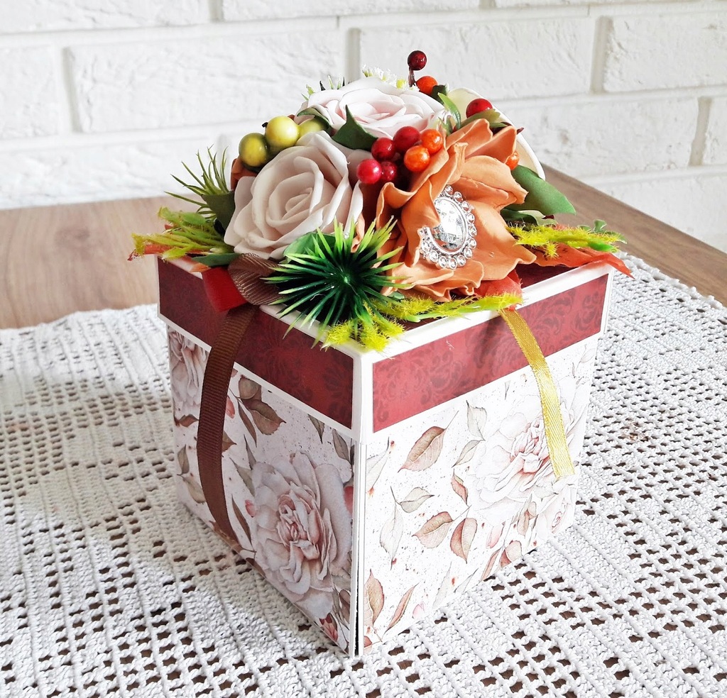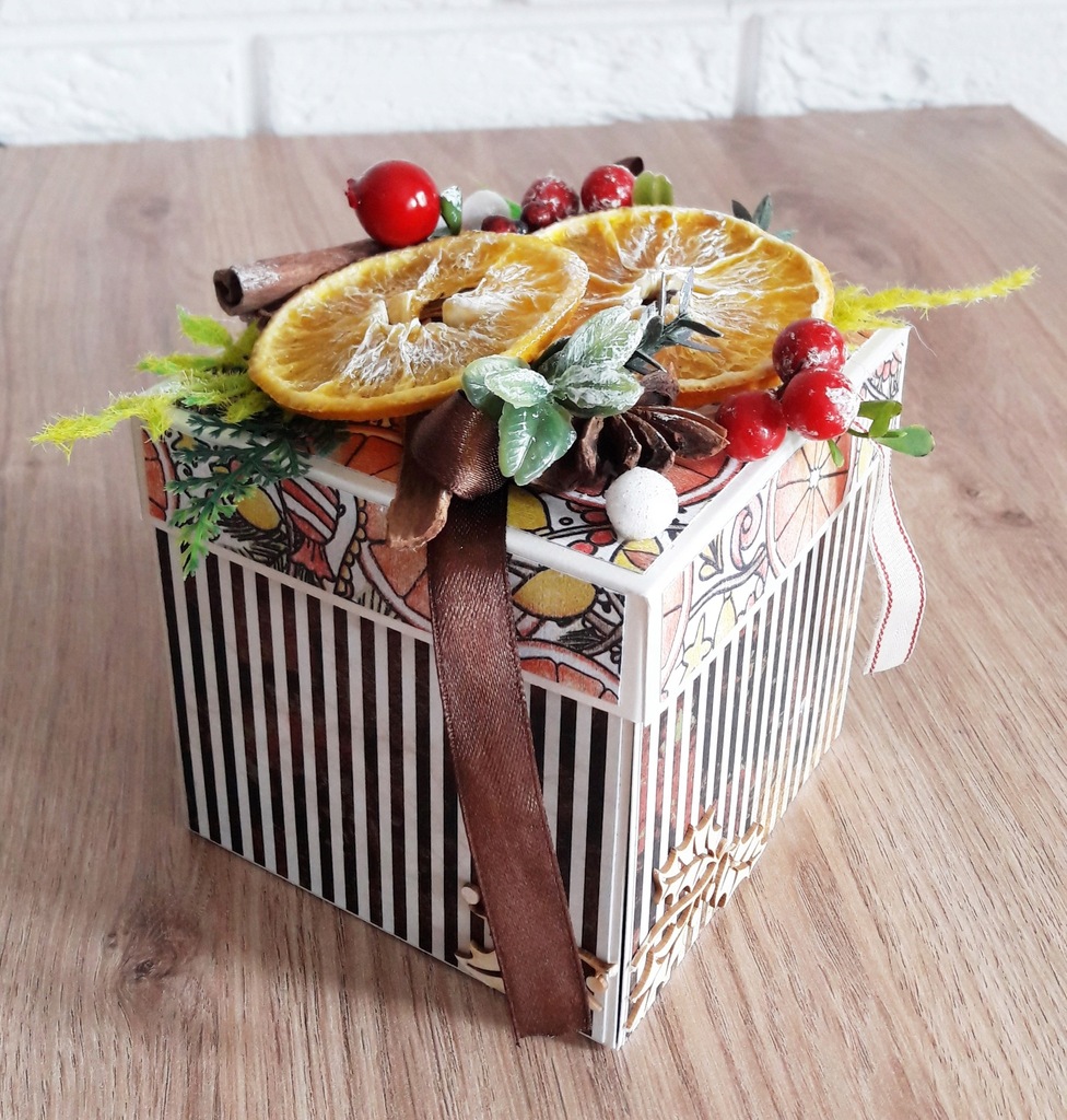 Pudełka zawsze wykonane są ręcznie z pełną dbałością o szczegóły. Wymiar złożonego pudełka to ok. 10x10x10 cm.
