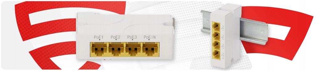 - Porty: 4 porty 10/100/1000 Mb/s (1 x PoE IN + 3 x PoE OUT) z automatyczną negocjacją szybkości połączeń, automatycznym krosowaniem Auto MDI/MDIX)