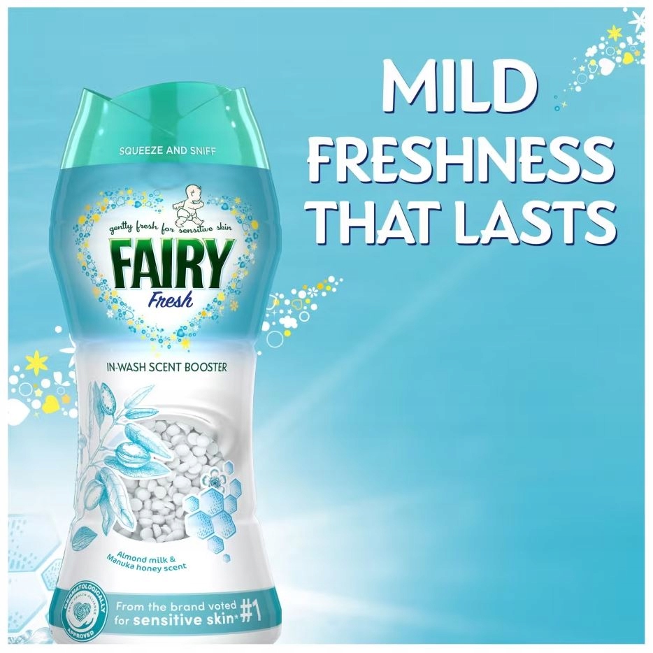 Utrzymuj świeżość swoich ubrań dzięki Fairy In-Wash Fresh Scent Booster. Ma łagodny, świeży zapach mleka migdałowego i miodu manuka, który utrzymuje się przez długi czas. Testowany dermatologicznie - jest delikatnie świeży dla wrażliwej skóry i można go dodawać do każdego prania ze wszystkich rodzajów tkanin.