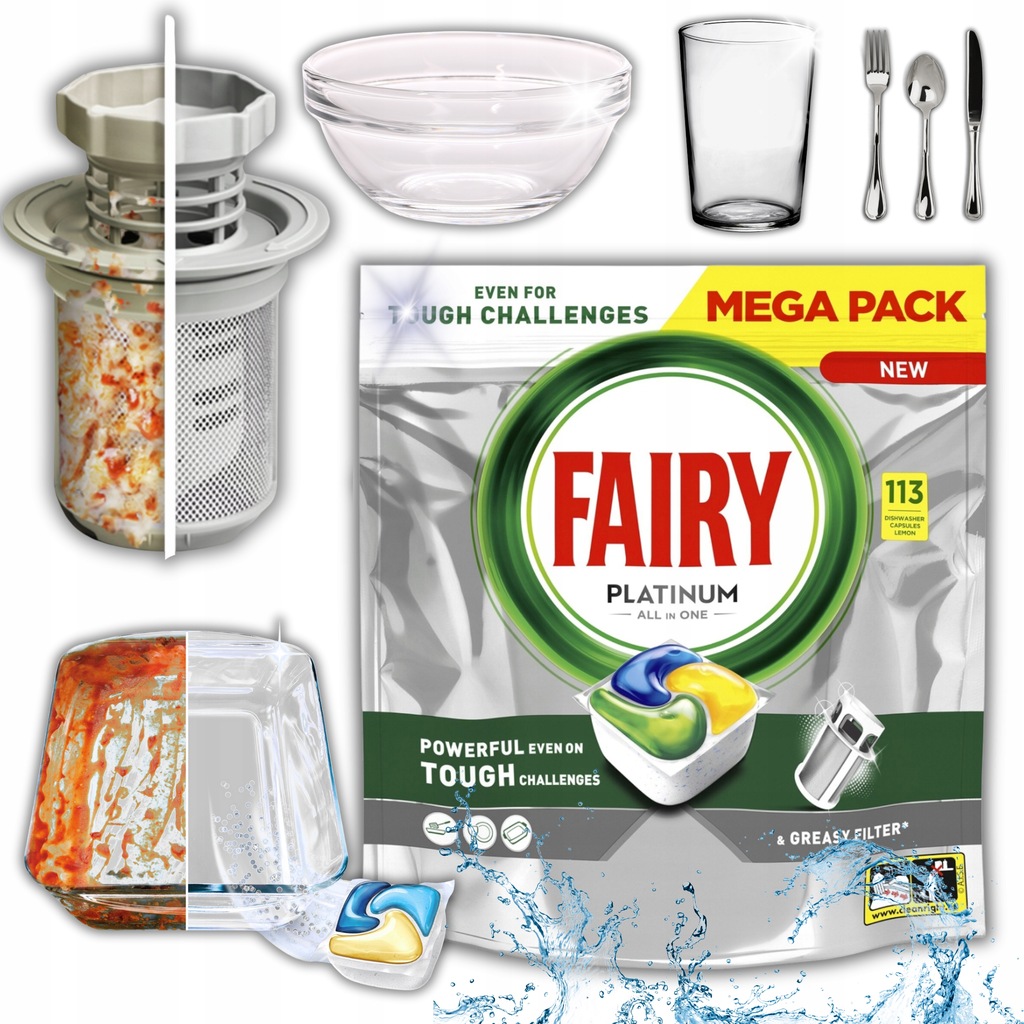 Kapsułki do zmywarki All In One Fairy Platinum działają już przy 1. myciu i usuwają nawet trudne zabrudzenia, pozostawiając naczynia czyste i lśniące. Dzięki mocy czyszczenia kapsułek do zmywarki Fairy Platinum możesz bez obaw przygotowywać wszelkie posiłki, wiedząc, że poradzą sobie nawet z tłustym filtrem, a naczynia i zmywarka będą czyste i pachnące świeżością. Kapsułki do zmywarki Fairy to połączenie płynu i proszku w jednej wydajnej kapsułce. Nasze kapsułki rozpuszczają się niezwykle szybko, dzięki czemu od razu zaczynają działać. A ich użycie jest bardzo proste. Nie musisz ich rozpakowywać. Wystarczy umieścić je w dozowniku detergentu zmywarki do naczyń.