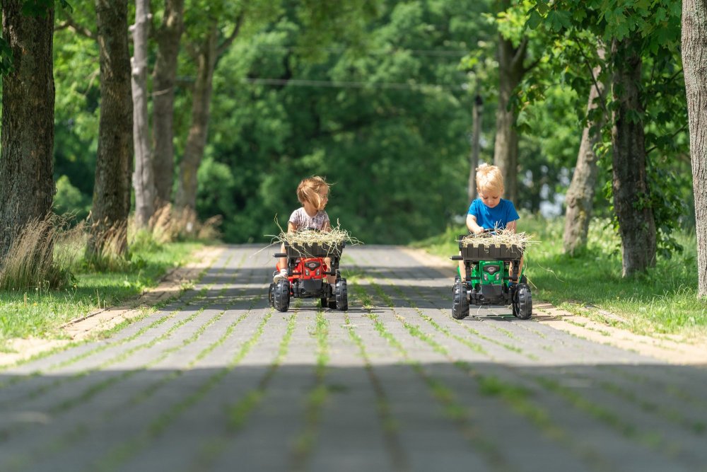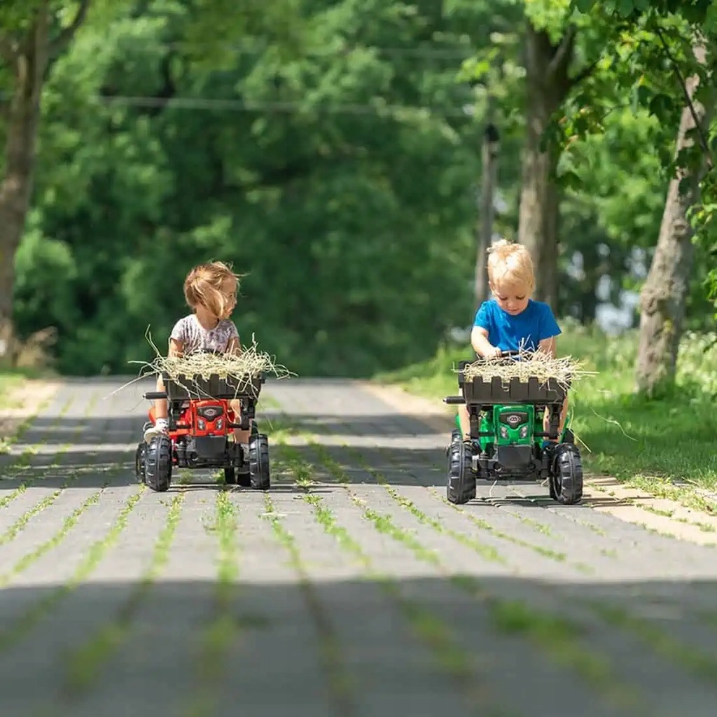 Traktor na pedały z przyczepą Red Supercharger firmy Falk to spełnienie marzeń niejednego małego traktorzysty. Starannie wykonany, z dbałością o najmniejszy szczegół! Żaden Farmer by takim nie pogardził. Pojazd wykonany z najwyższej jakości tworzywa przeznaczony dla dzieci w wieku od 2 lat. Pojazd jest wyposażony w przednią łyżkę oraz odpinaną przyczepę z panelami i kierownicę z klaksonem. Koła traktorka zostały wykonane z wysokiej jakości plastiku. Traktor posiada również otwieraną maskę z imitacją prawdziwego silnika.