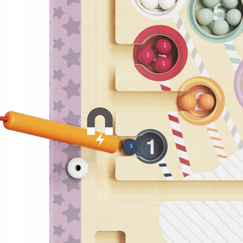 Po drodze, dzieci muszą jednak pokonać kilka ruchomych przeszkód. Słodycze są ponumerowane od jednego do dziesięciu i każdy ma swój własny kolor. W poszczególnych kolorach jest tylko tyle koralików, ile wynosi numer odpowiadającego mu lizaka. W ten sposób dzieci uczą się rozróżniać barwy, ale też poznają liczby od jednego do dziesięciu. Zabawa wspiera rozwój umiejętności motorycznych, koordynacji ręka-oko, koncentracji, uwagi i cierpliwości.