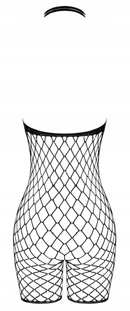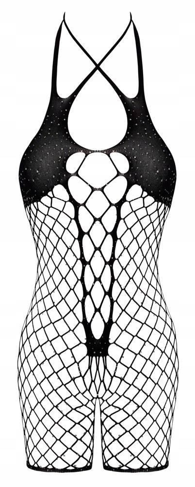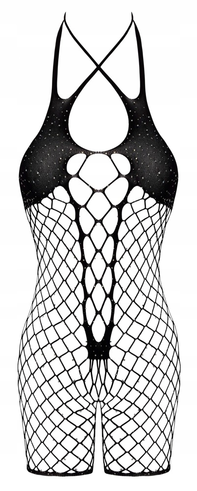 Ozdobione błyszczącymi kryształkami. Bezszwowe i elastyczne dla wysokiego poziomu komfortu. Uwodzicielsko otwarte w kroku. Podwójny, bardzo elastyczny halterneck może być również noszony na krzyż na dekolcie.