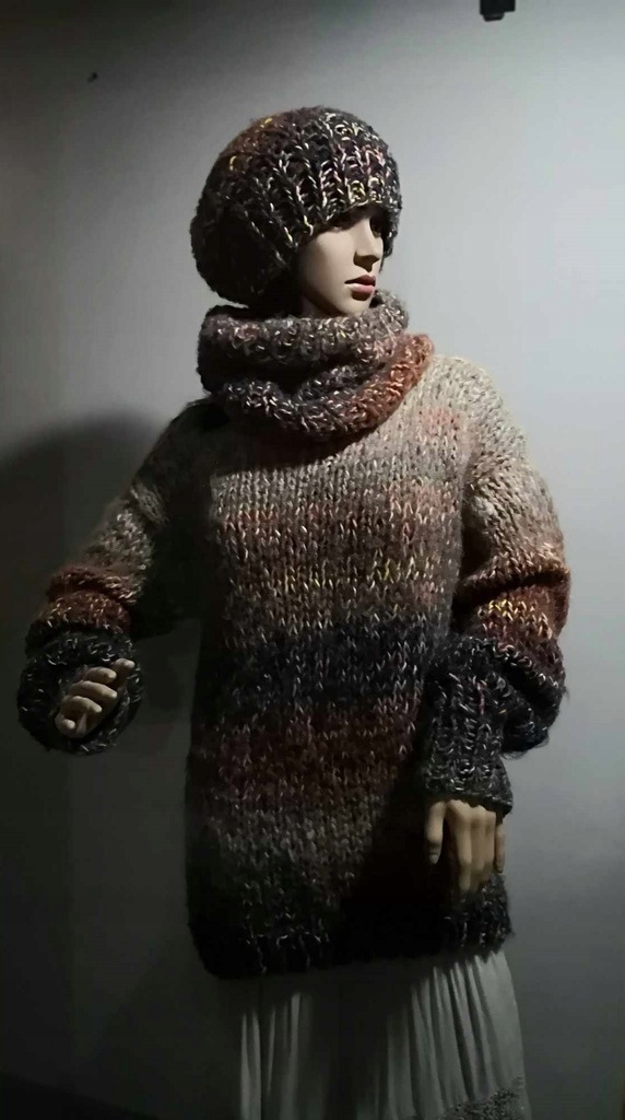 Sweter prezentuje się bardzo ciekawie, nieco przedłużony tył