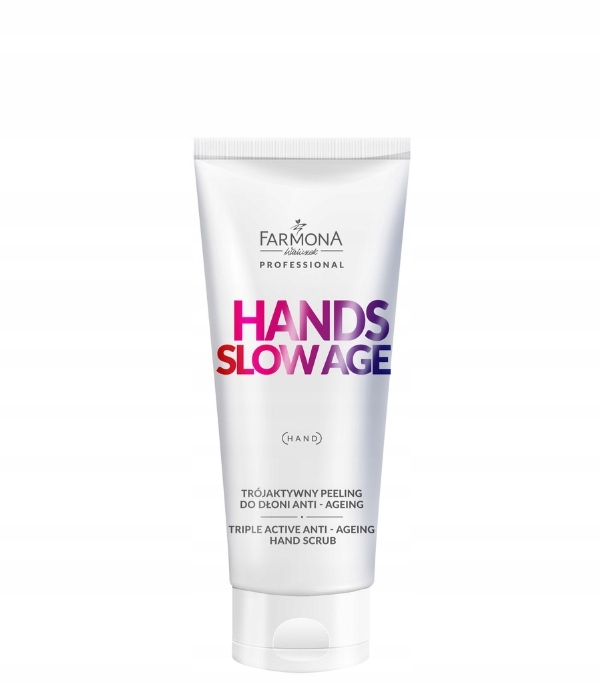 FARMONA HANDS SLOW AGE Trójaktywny peeling do dłoni anti-ageing 200ml Jak zachować młody i zdrowy wygląd skóry dłoni? To pytanie, na które każda Kobieta chciałaby znaleźć odpowiedź Wiedząc jakie zmiany zachodzą w skórze dłoni wraz z wiekiem, na jakie czynniki zewnętrzne jest ona narażona każdego dnia i czego potrzebuje by zachować zdrowy i młody wygląd, Specjaliści Laboratorium Kosmetyków Naturalnych FARMONA stworzyli linię HANDS SLOW AGE To linia, która w kompleksowy sposób nie tylko opóźnia pojawienie się oznak starzenia skóry dłoni, ale również niweluje widoczne już na naszej skórze skutki jego upływu PRZEZNACZENIE: skóra szorstka, sucha, wymagająca regeneracji, z wyraźnymi oznakami starzenia – utratą jędrności i elastyczności, z przebarwieniami – posłonecznymi, starczymi, hormonalnymi POTRÓJNY SYSTEM ZŁUSZCZAJĄCO – WYGŁADZAJĄCY EFEKT: skuteczne oczyszczenie i złuszczenie martwych komórek naskórka rozjaśnienie przebarwień i zmniejszenie ich widoczności wyrównanie kolorytu, wygładzenie skóry dłoni poprawienie jej wyglądu i kondycji oraz przygotowanie do dalszych etapów zabiegu EKSPRESOWE DZIAŁANIE I NATYCHMIASTOWY EFEKT