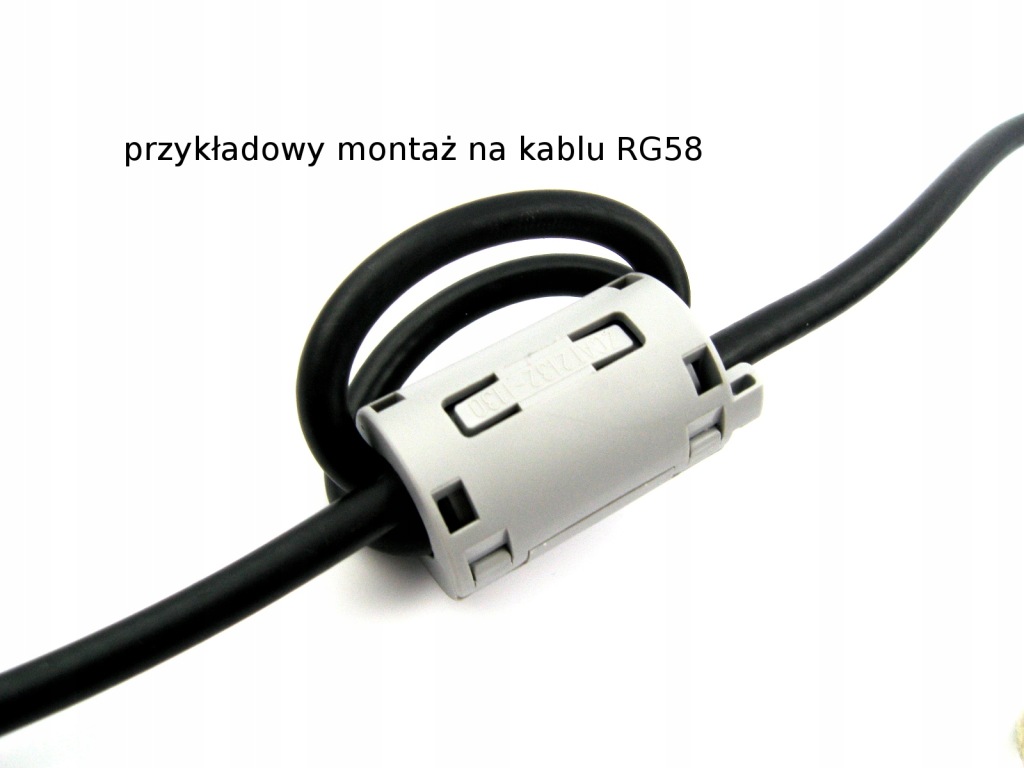 W przypadku cieńszych przewodów (np. antenowy CB RG58, mikrofonowy) kabel można owinąć kilkukrotnie wokół filtra ferrytowego.
