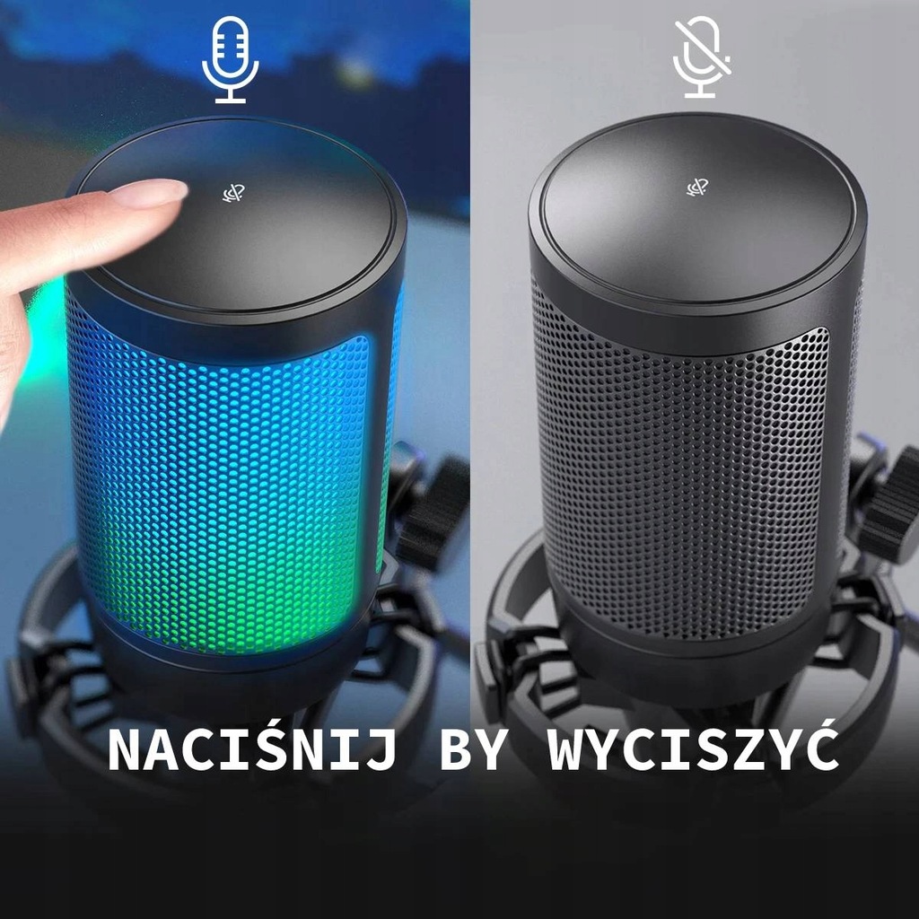 - Użyj wygodnej funkcji tap-to-mute,. Jeśli światło jest włączone, mikrofon jest aktywny, jeśli światło jest wyłączone, mikrofon jest wyciszony, wystarczy dotknąć górnej części mikrofonu.
