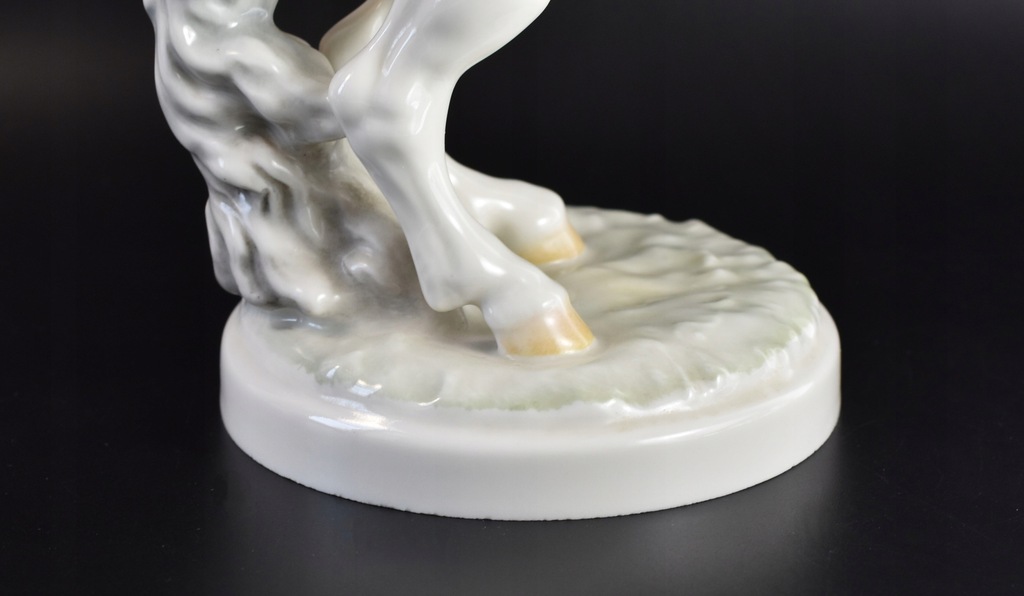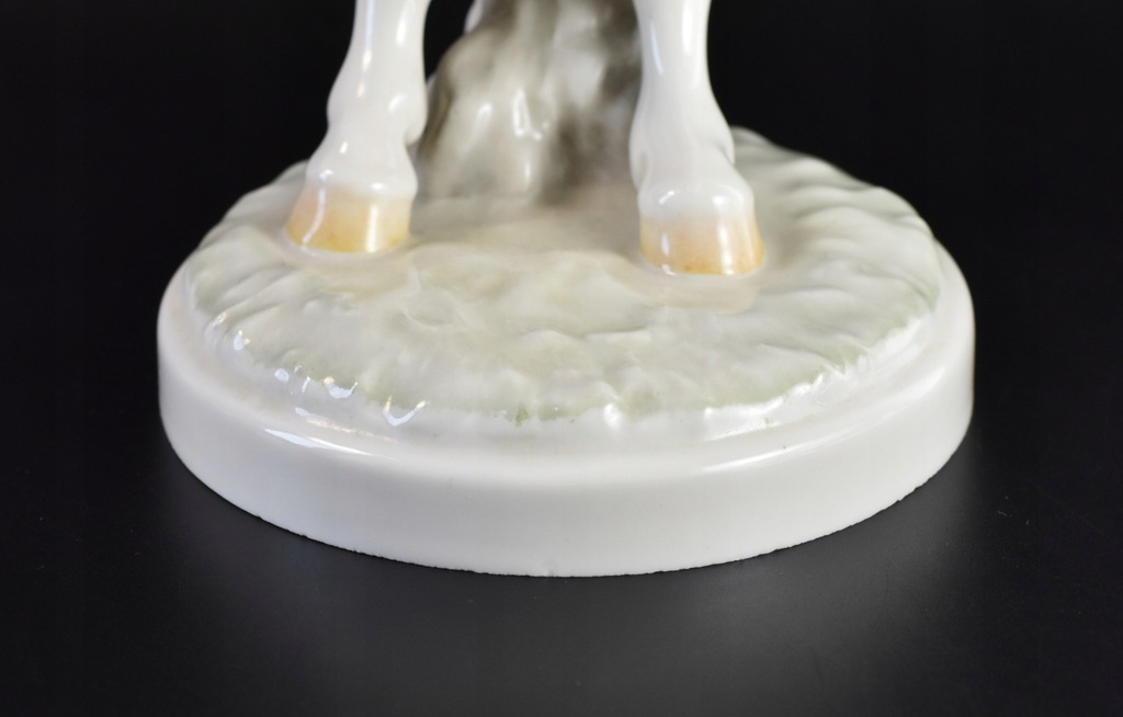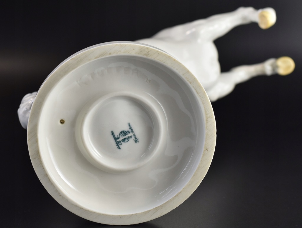Stan: bardzo dobry z małymi śladami użytkownia. Jedno przecięcie na sygnaturze dla oznaczenia 2. gatunku, prawdopodobnie ze względu na mikro-uszczypnięcia / nierówności w glazurze na podstawie figurki, w tym jeden mini-odprysk również w glazurze, nie są one jednak praktycznie widoczne.