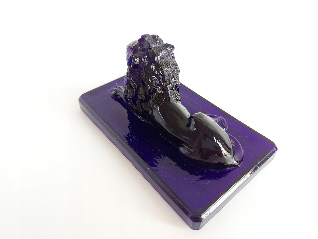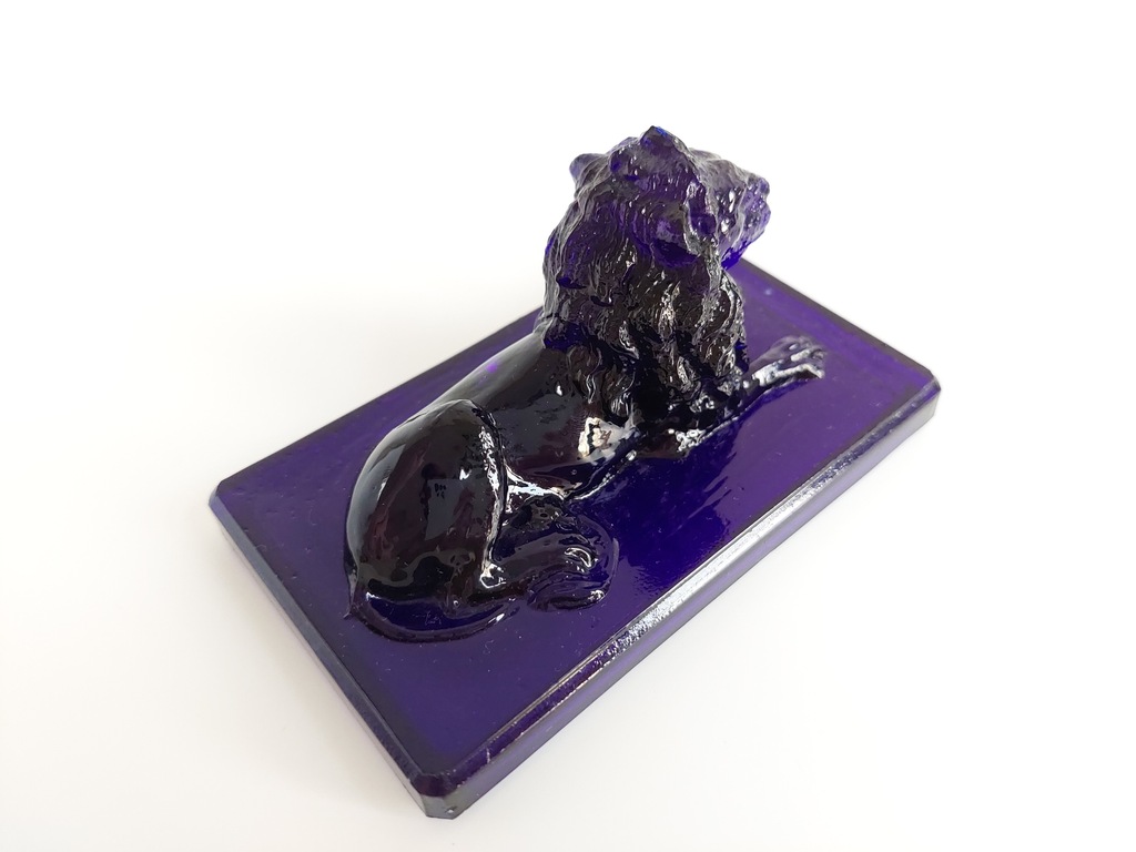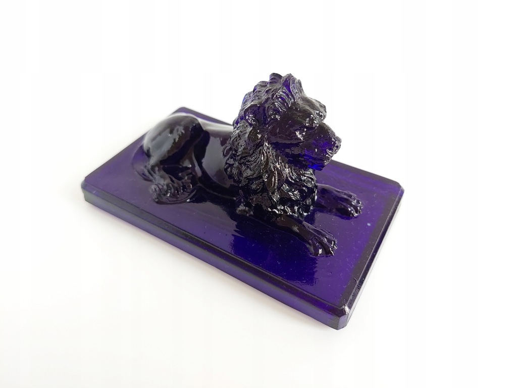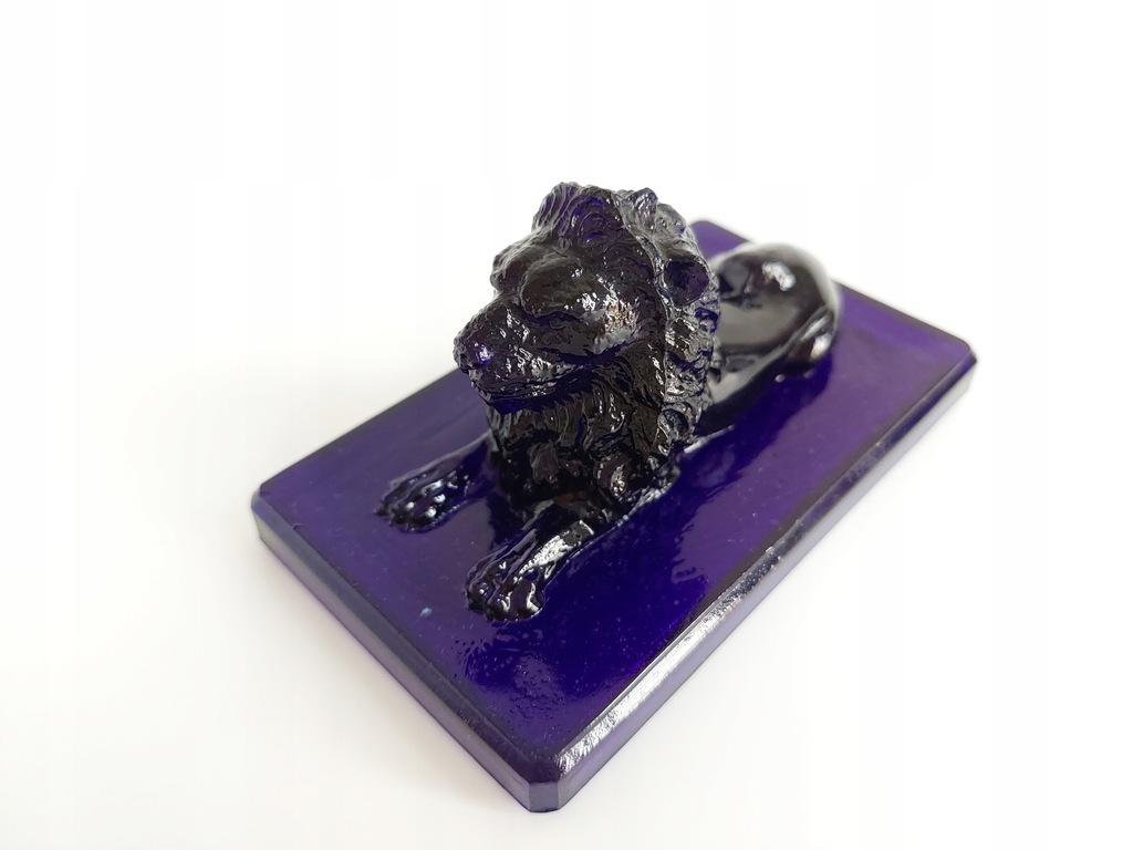 Szklany przycisk do papieru z figurką lwa - kolor niebieski/kobaltowy, barwiony w masie.