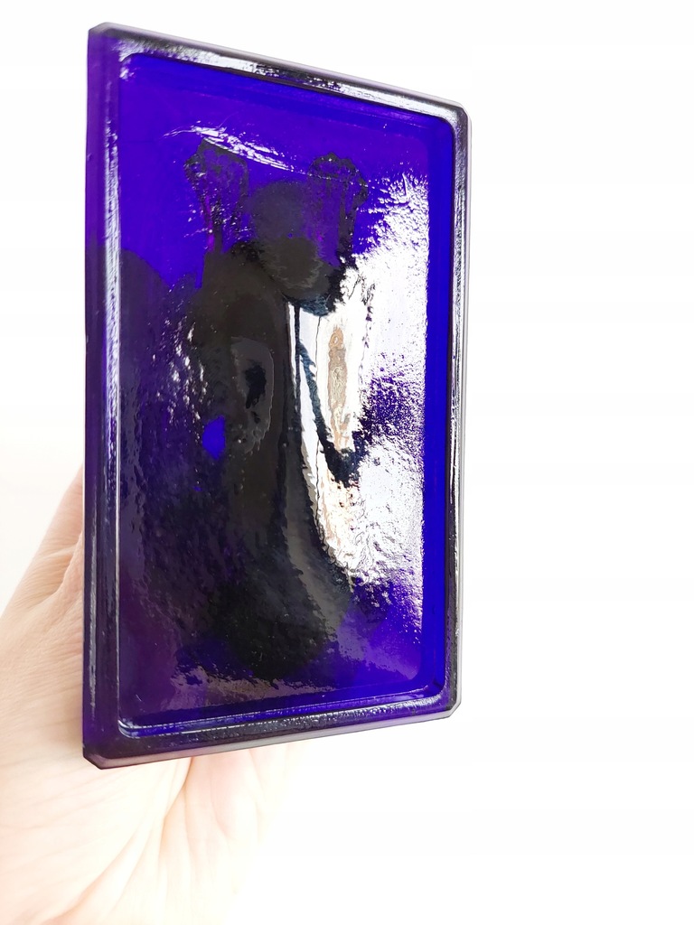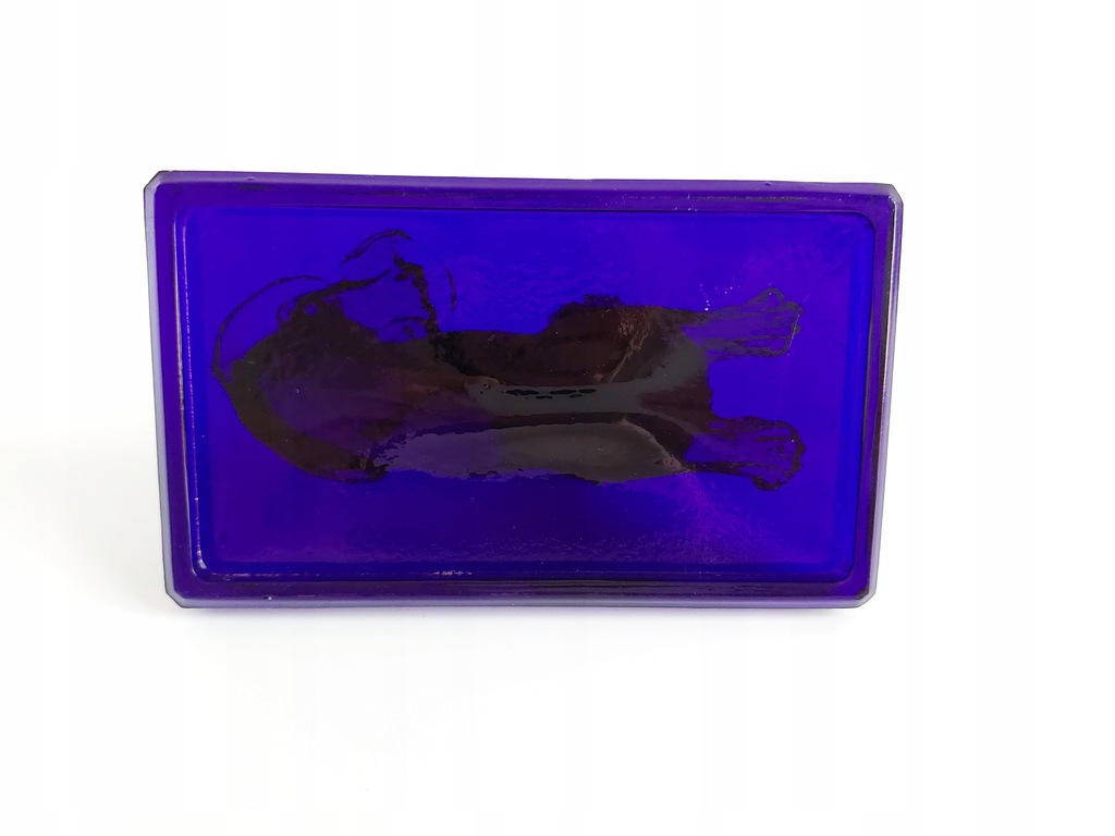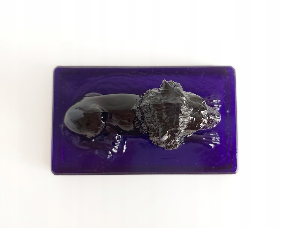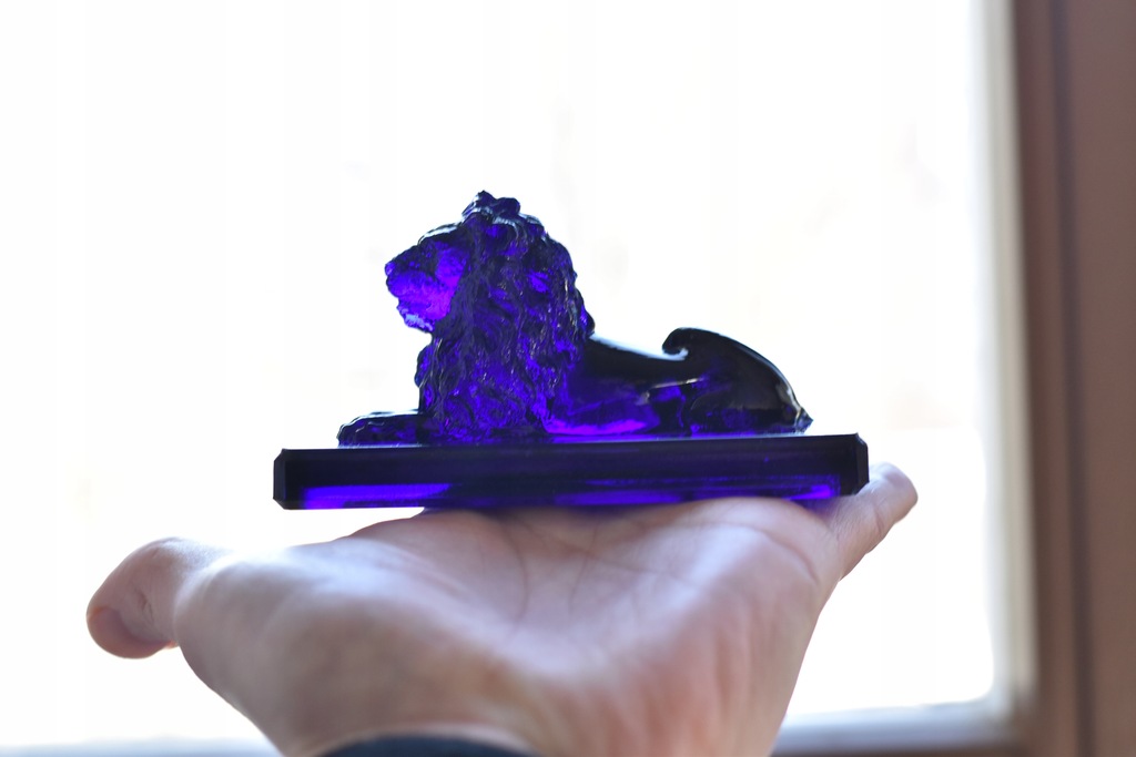 Szklany przycisk do papieru z figurką lwa - kolor niebieski/kobaltowy, barwiony w masie.