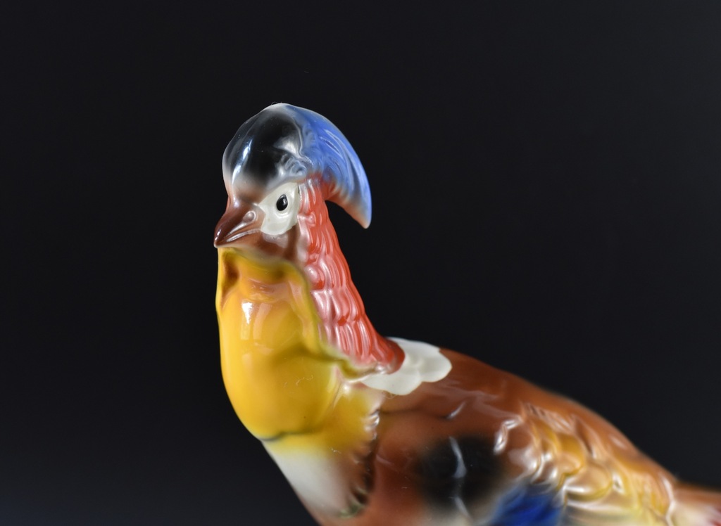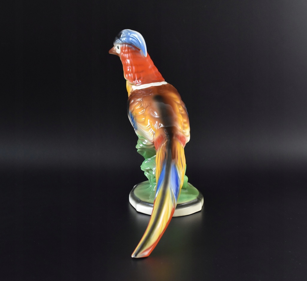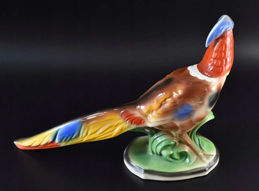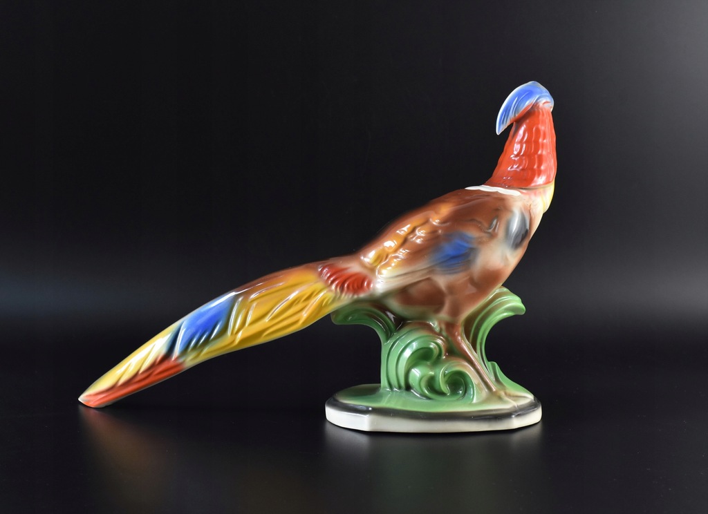 Duża, ręcznie malowana figurka samca bażanta. Wyprodukowana została w latach 50-tych XX wieku w Państwowych Zakładach Porcelitu Stołowego w Tułowicach. Wyraziste detale i wysoka jakość wykonania.