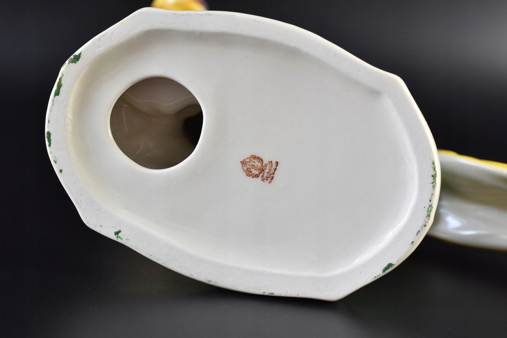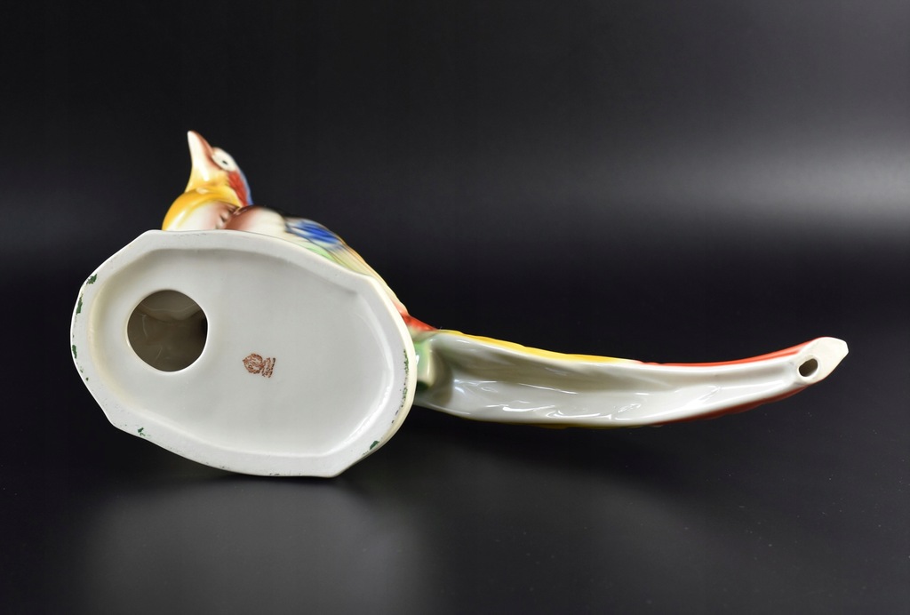 Figurka sygnowana jest znakiem PT Tułowice Made in Poland, który stosowano od lat 50-tych XX wieku. To właśnie wtedy w fabryce powstawały figurki porcelitowe wykonane jeszcze na przedwojennych formach z manufaktury Rheinholda Schlegelmilcha. Zalicza się do nich również figurka bażanta.