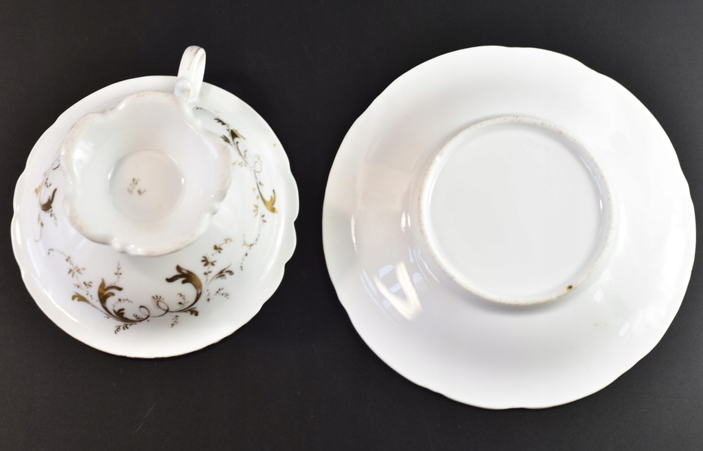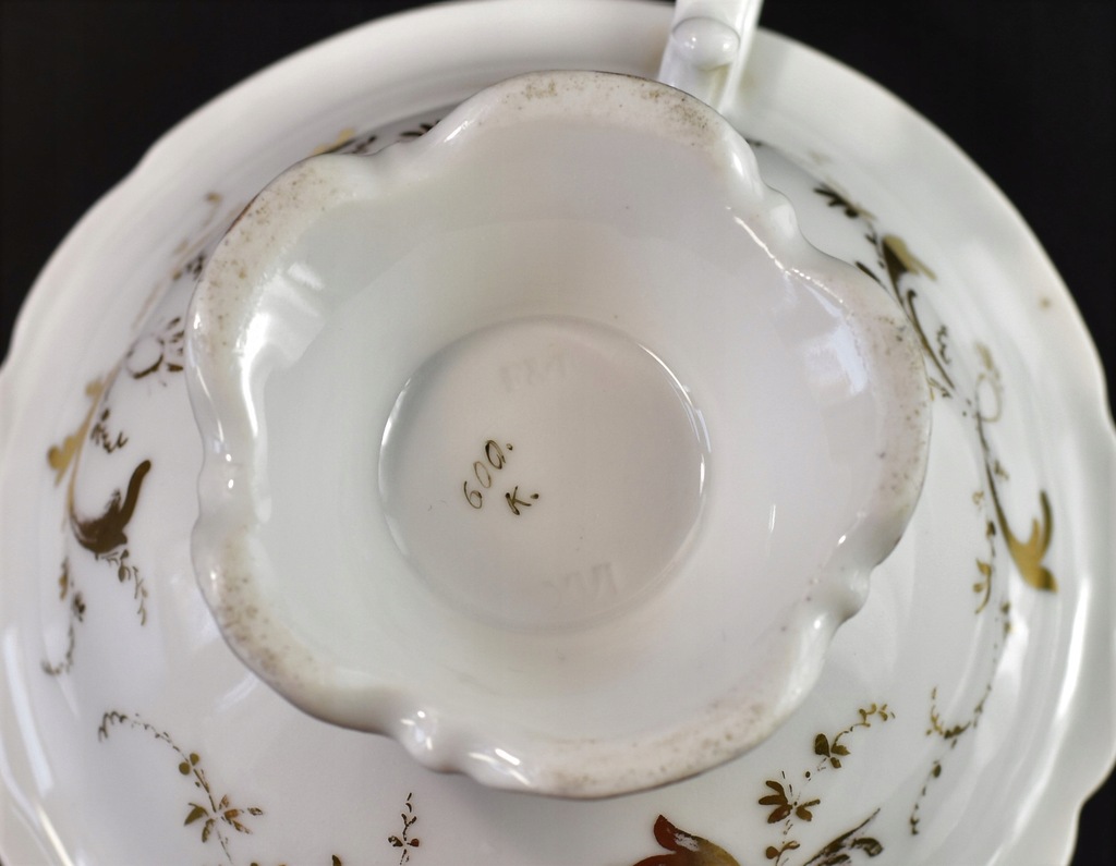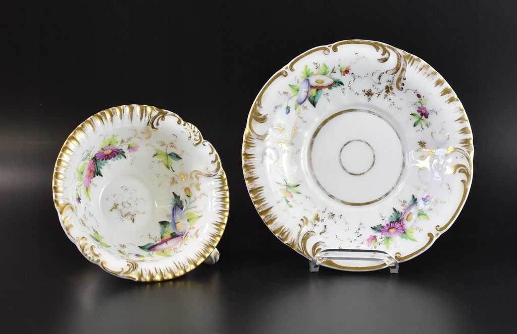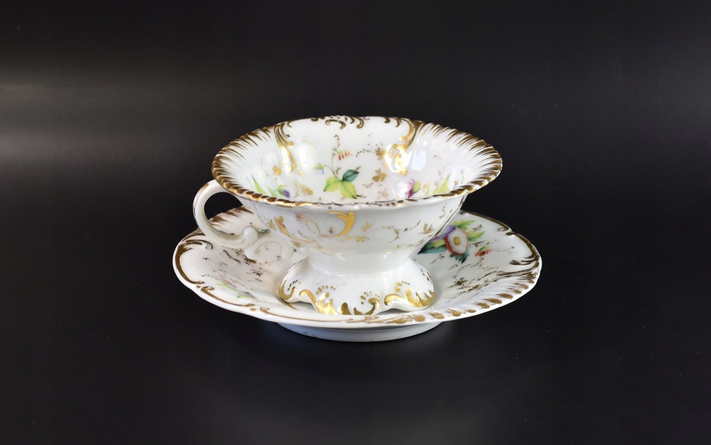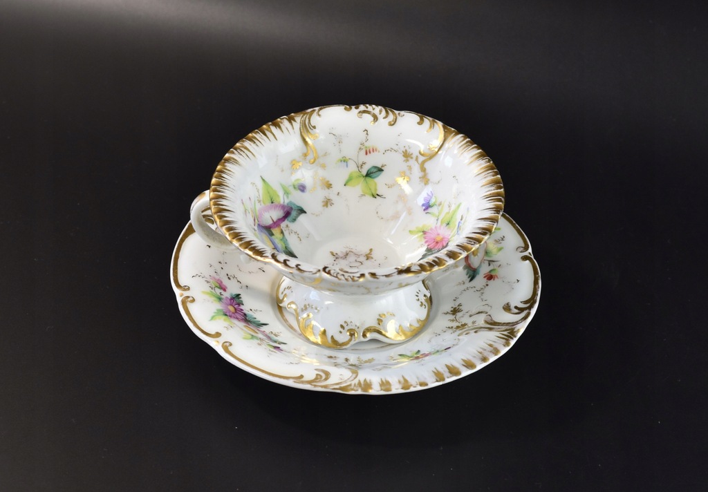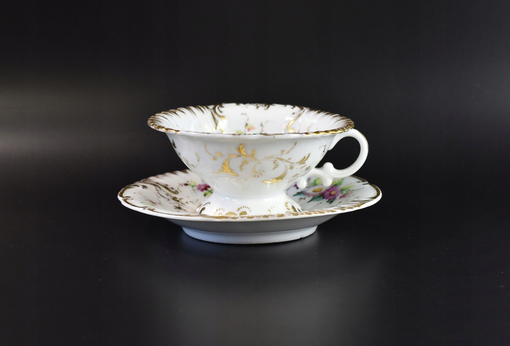 Dziewiętnastowieczna filiżanka ze spodkiem z dawnej Bohemii. Porcelana wyprodukowana została w manufakturze Fischer & Reichenbach, która znajdowała się w miejscowości Pirkenhammer (dzisiejsze Czechy).