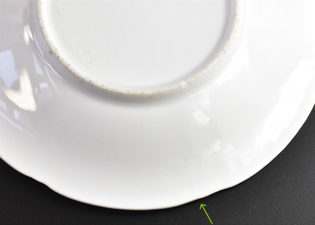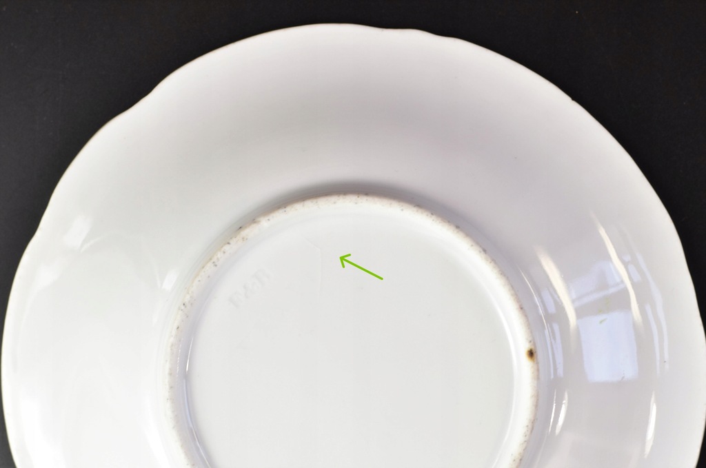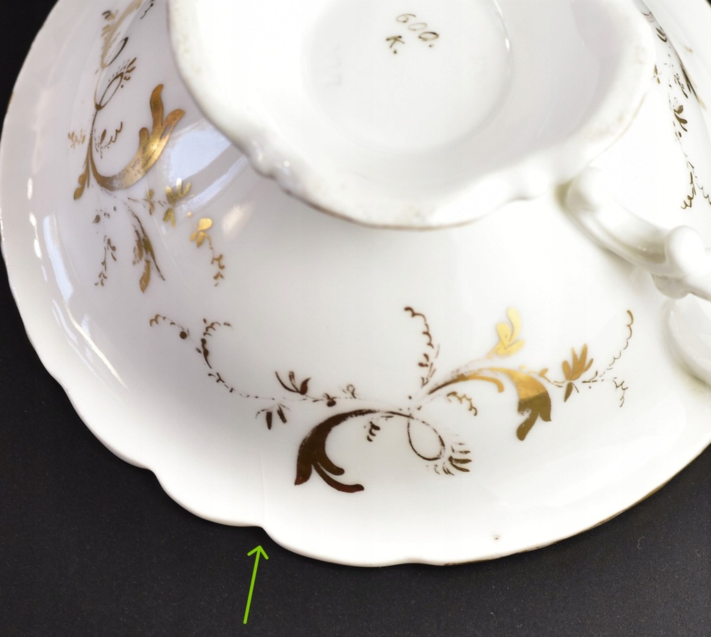 Stan: filiżanka ma jedną małą rysę włosowatą, spodek ma również jedną rysę włosowatą oraz małego "pajączka" (wszystko zaznaczone na zdjęciach); poza tym filiżanka jest ładnie zachowana z małymi, wiekowymi śladami użytkownia / przetarciami.
