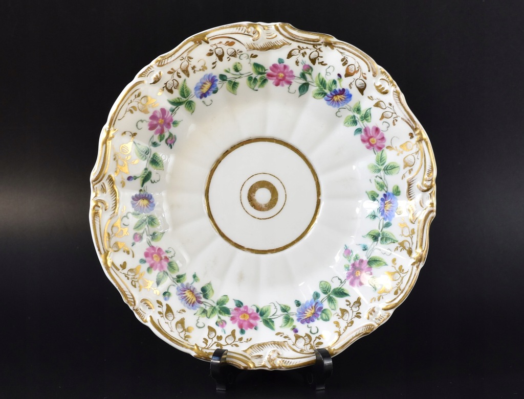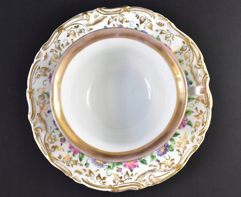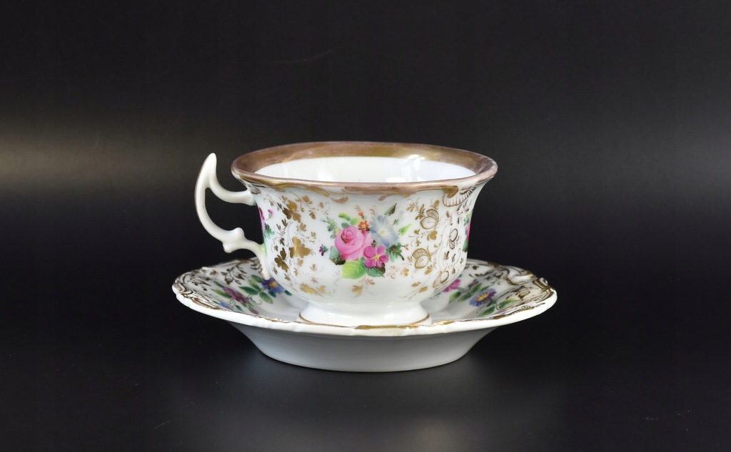 Kolorowe bukiety kwiatów w otoczeniu złotych, roślinnych ornamentów. Ranty ozdabiają delikatne reliefy. Filiżanka zakończona ciekawym, zadziornym uszkiem. Bogato dekorowane duo dobrane z dwóch manufaktur, pięknie do siebie pasujące. Filiżanka pochodzi z fabryki Carla Tielscha, która znajdowała się dawniej w Starym Zdroju, natomiast spodek pochodzi z fabryki F. A. Schumanna z Berlina-Moabitu.