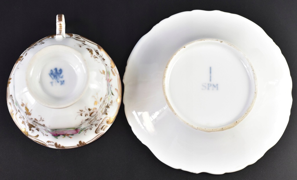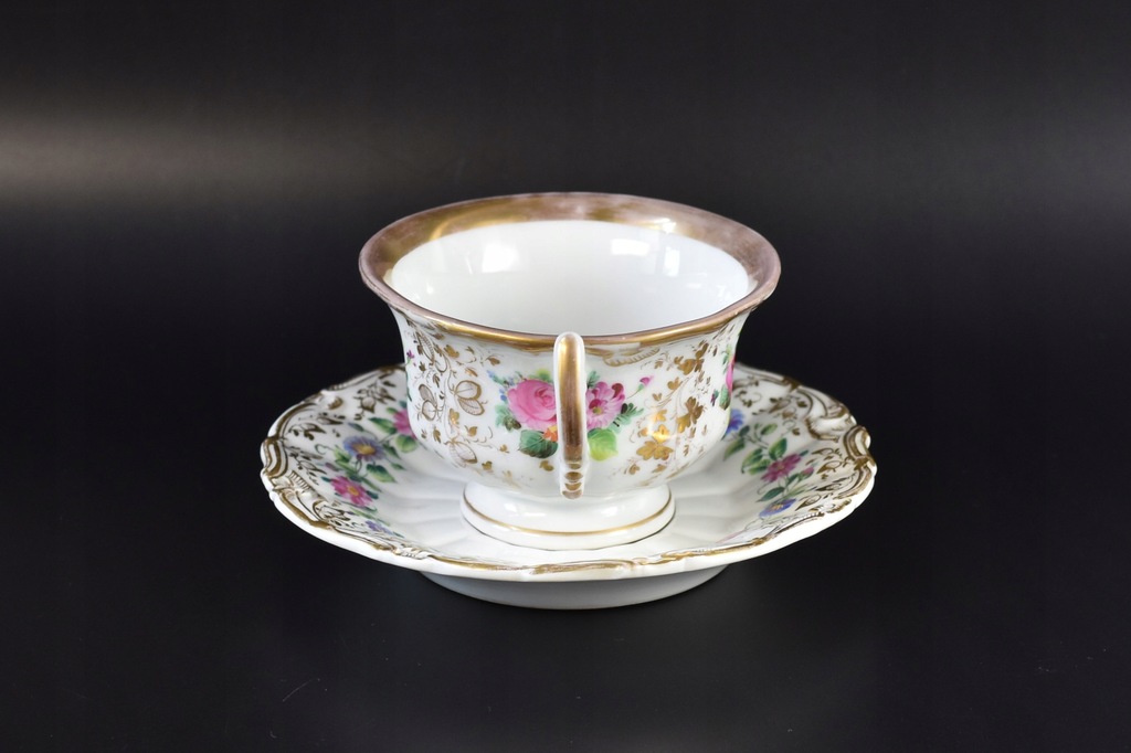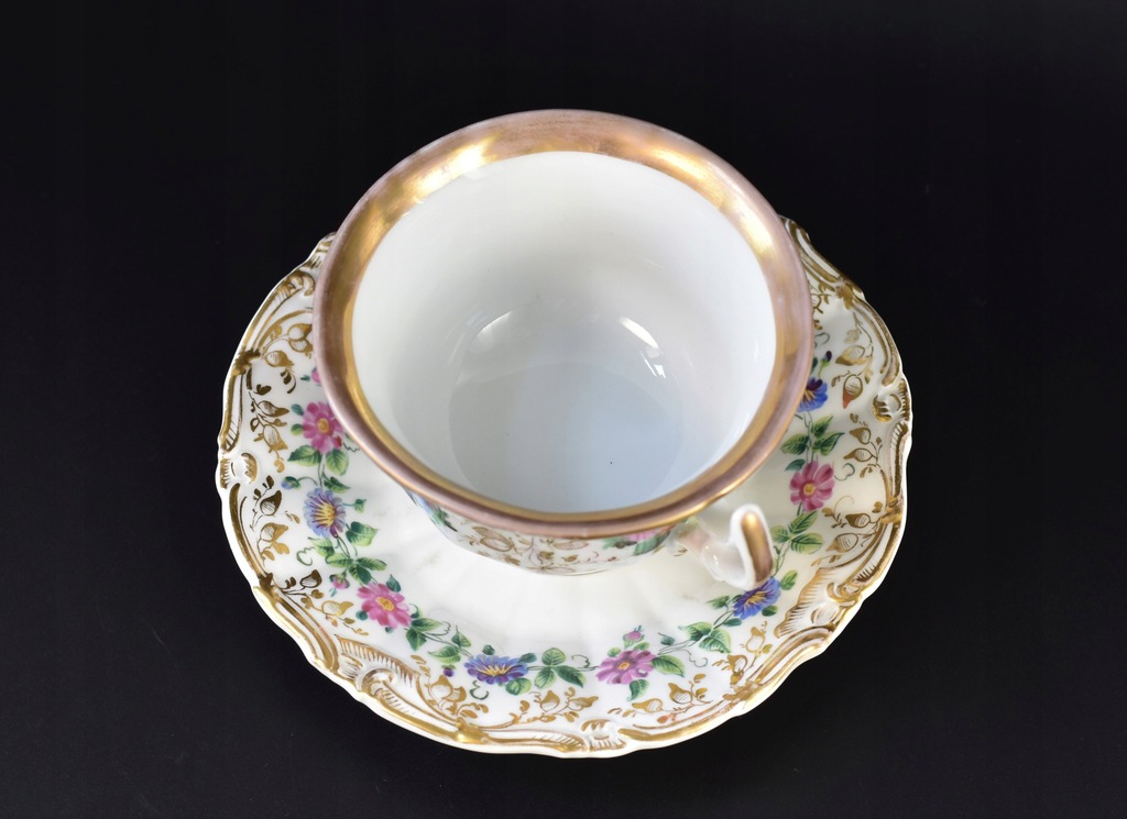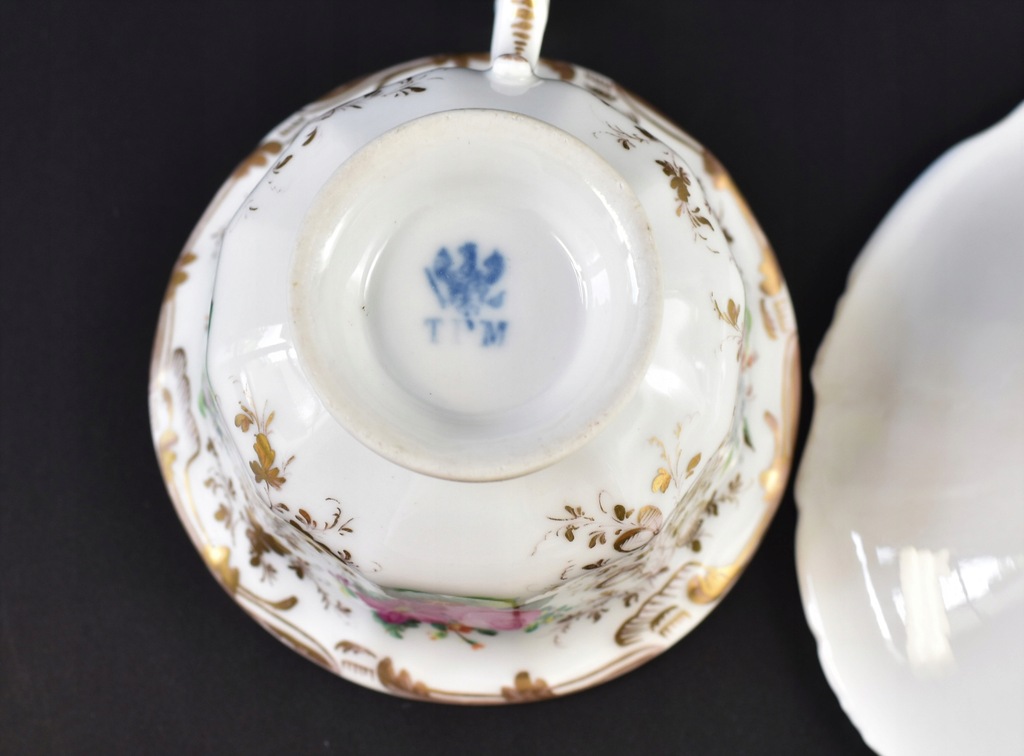 Stan: bardzo dobry z małymi, wiekowymi śladami użytkowania czy przetarciami złoceń (głównie na rancie filiżanki); bez uszkodzeń.
