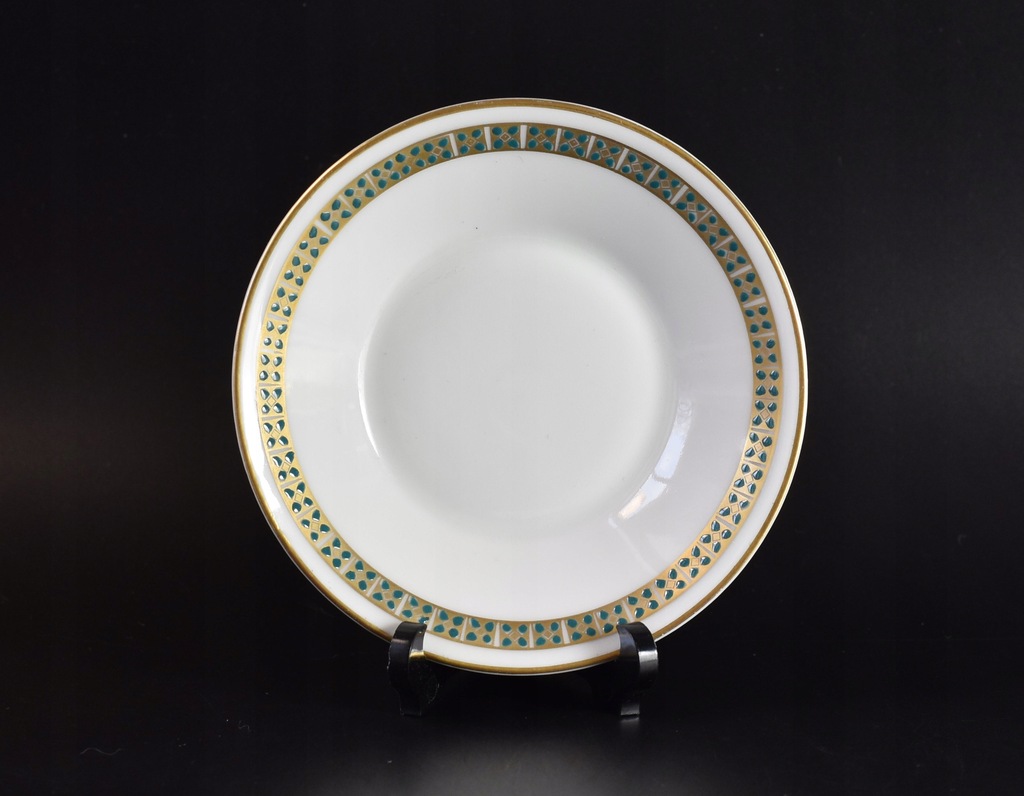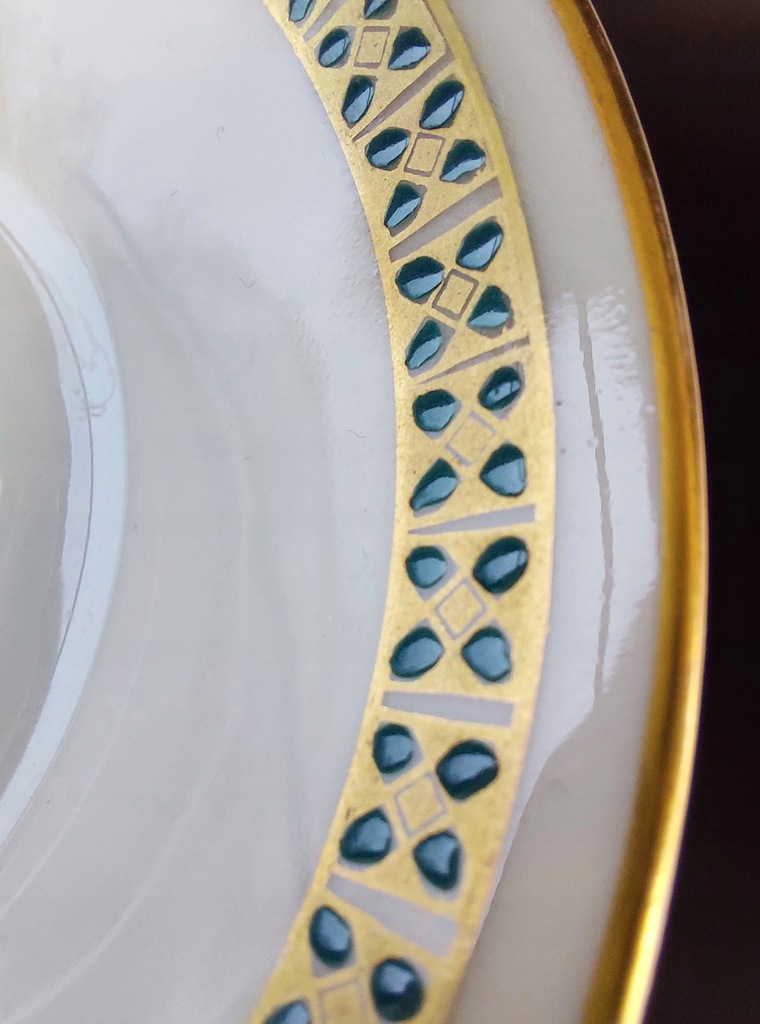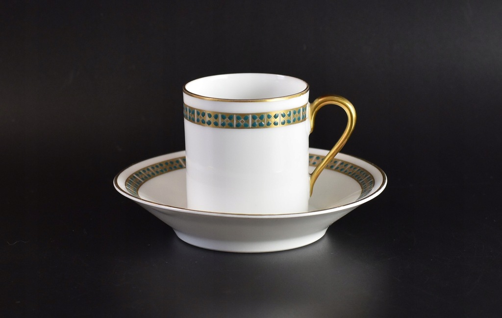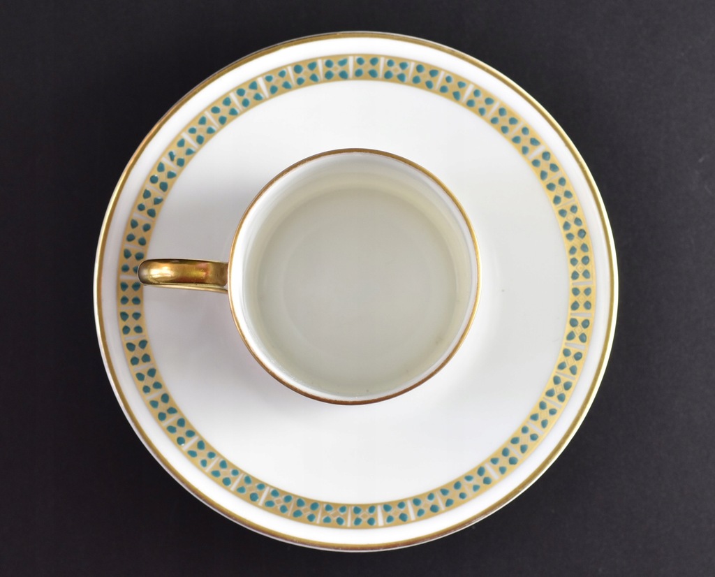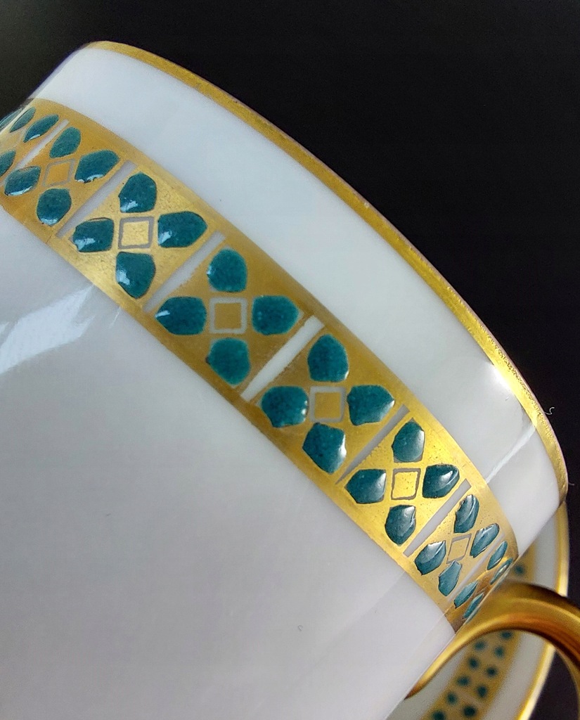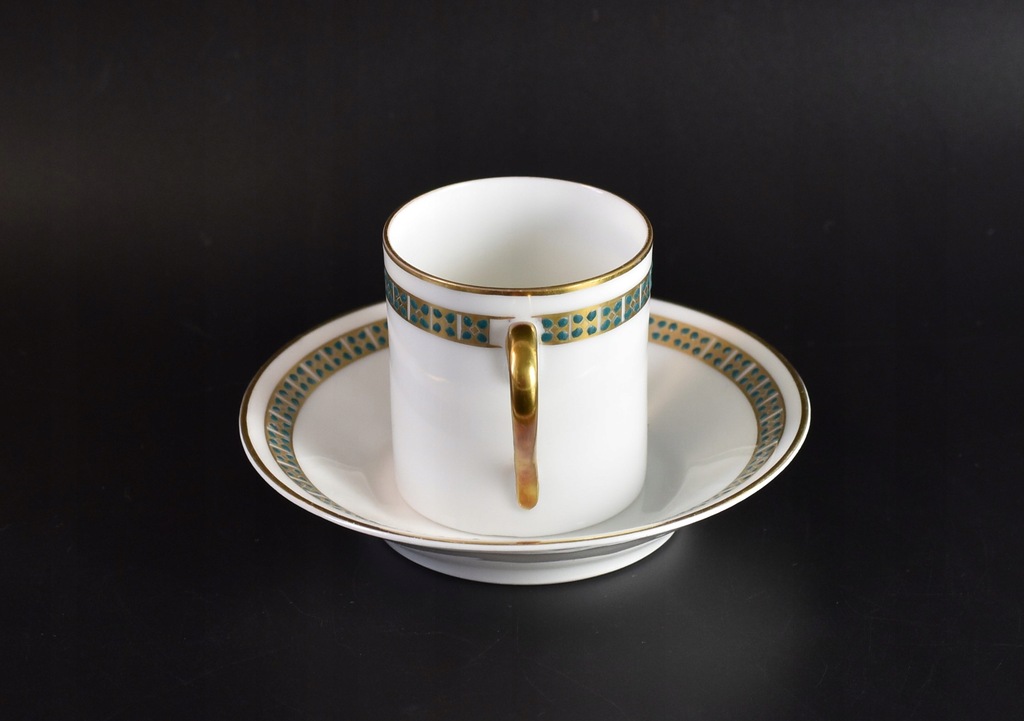 Delikatna, biała porcelana podkreślona subtelnym dekorem w postaci złotego pasa, wypełnionego podwójnym szlaczkiem ciemnoturkusowych kropek, wykonanych emalią. Bardzo eleganckie i wyrafinowane połączenie