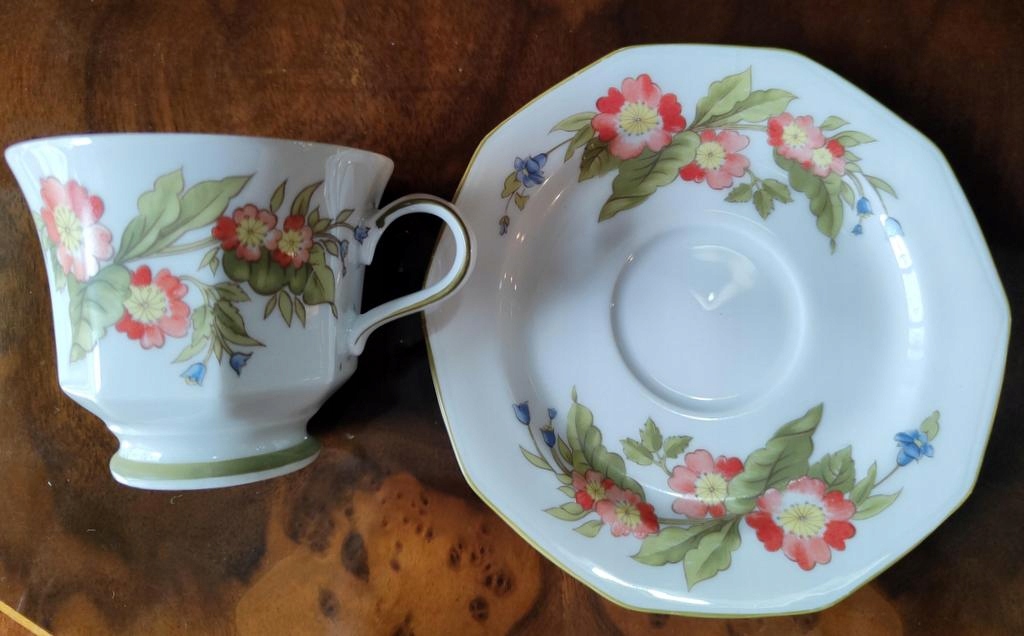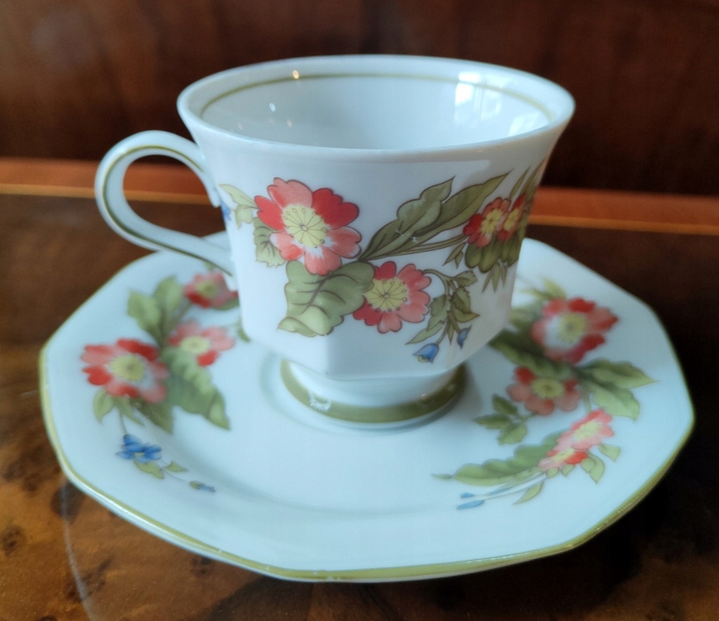 Filiżanka ze spodkiem. Stan porcelany oceniam na bardzo dobry - bez uszkodzeń. Zestaw zachwyca uroczą, kolorystyką, oraz finezyjnym kształtem. Wspaniały komplet będzie np. super niezobowiązującym prezentem, praktycznym i ozdobnym elementem stylowego wnętrza, a mała czarna nabierze niepowtarzalnego smaku.