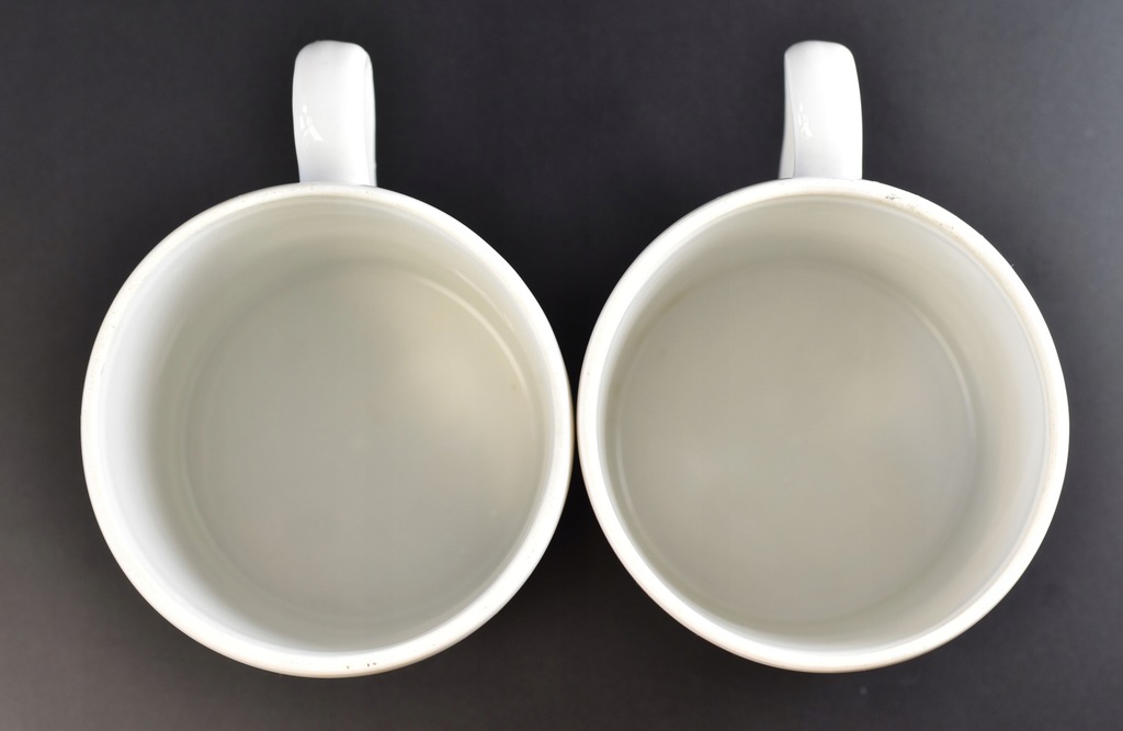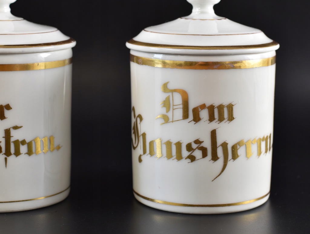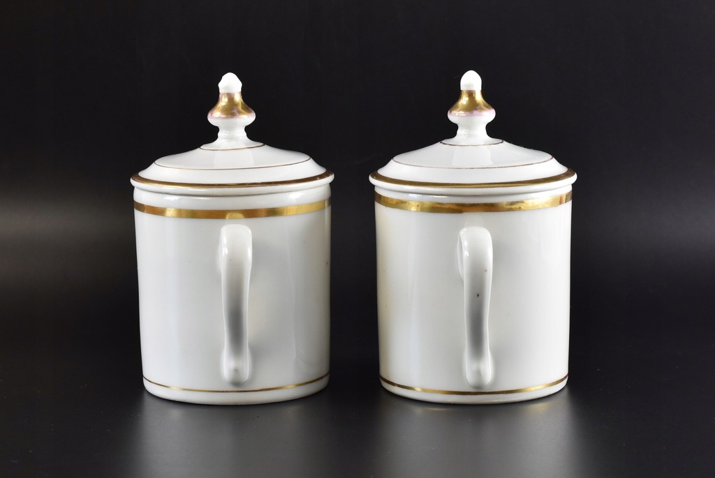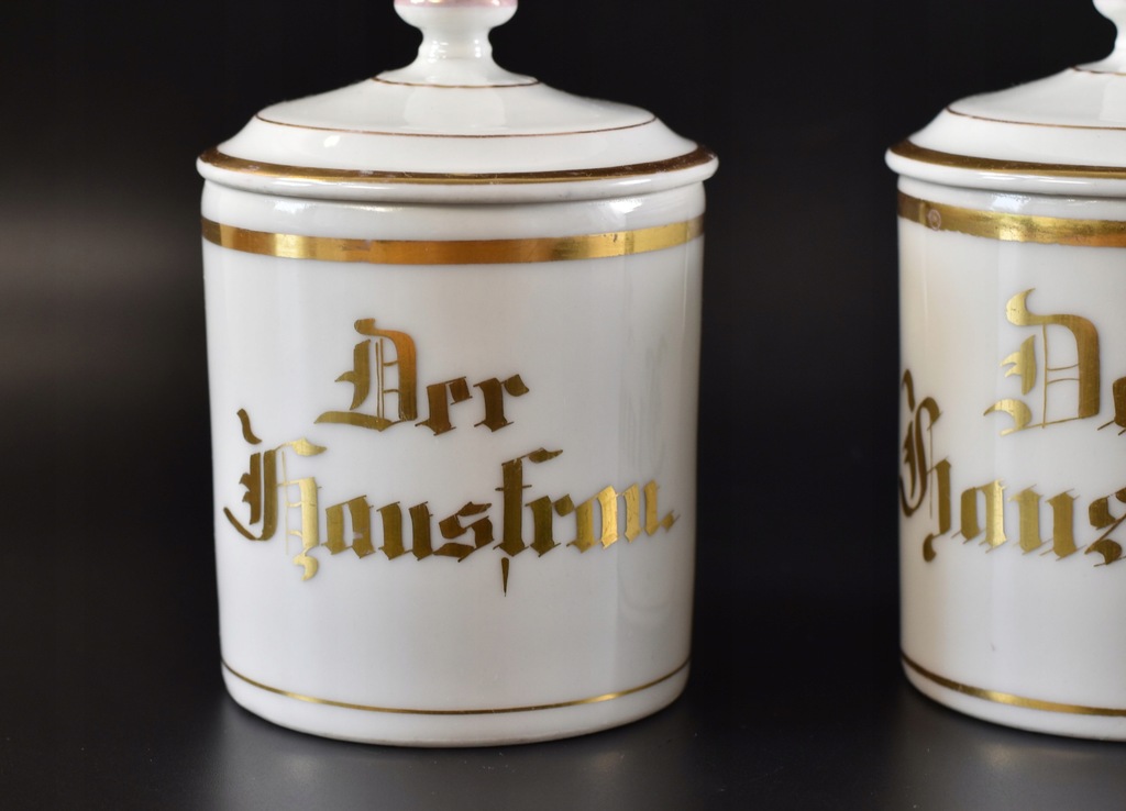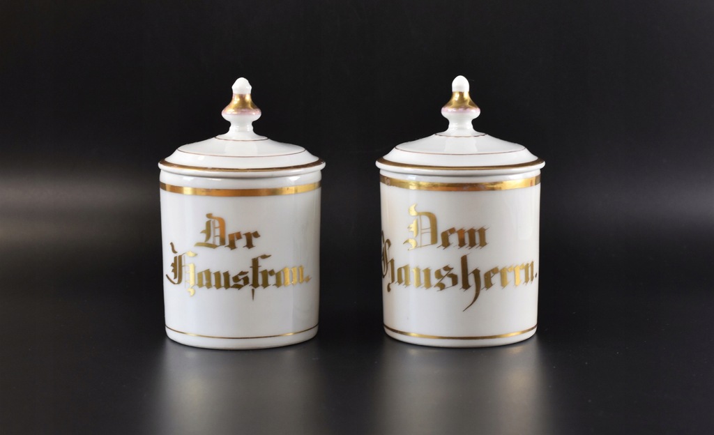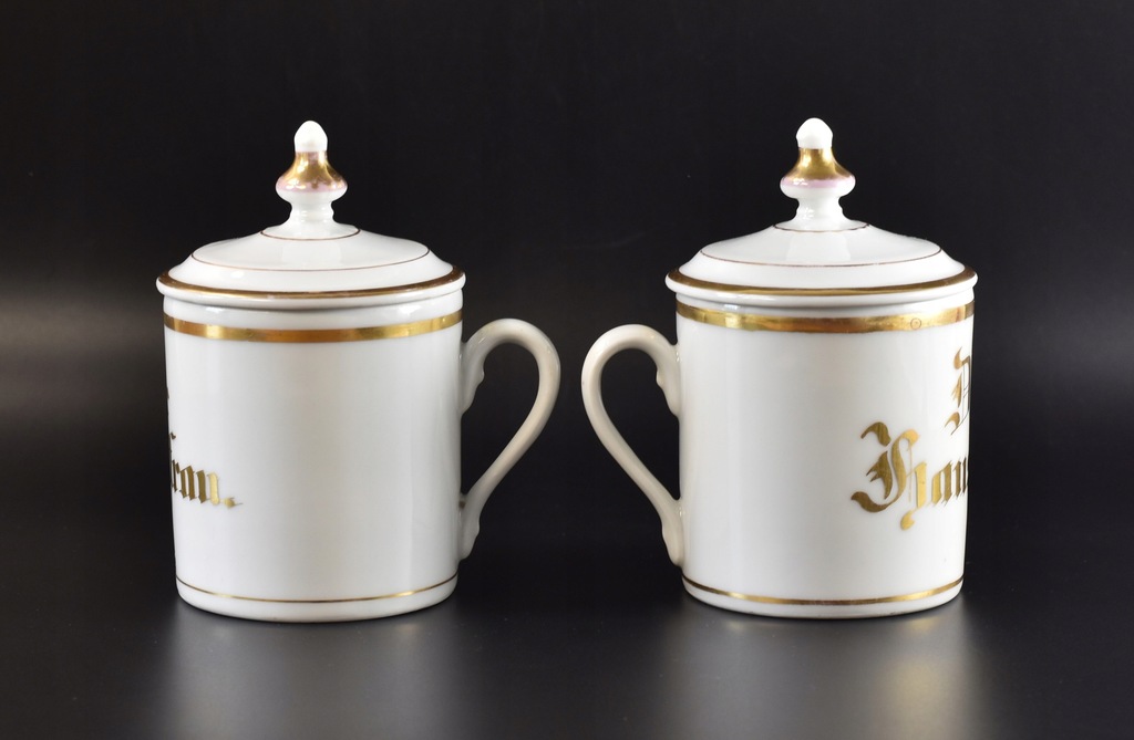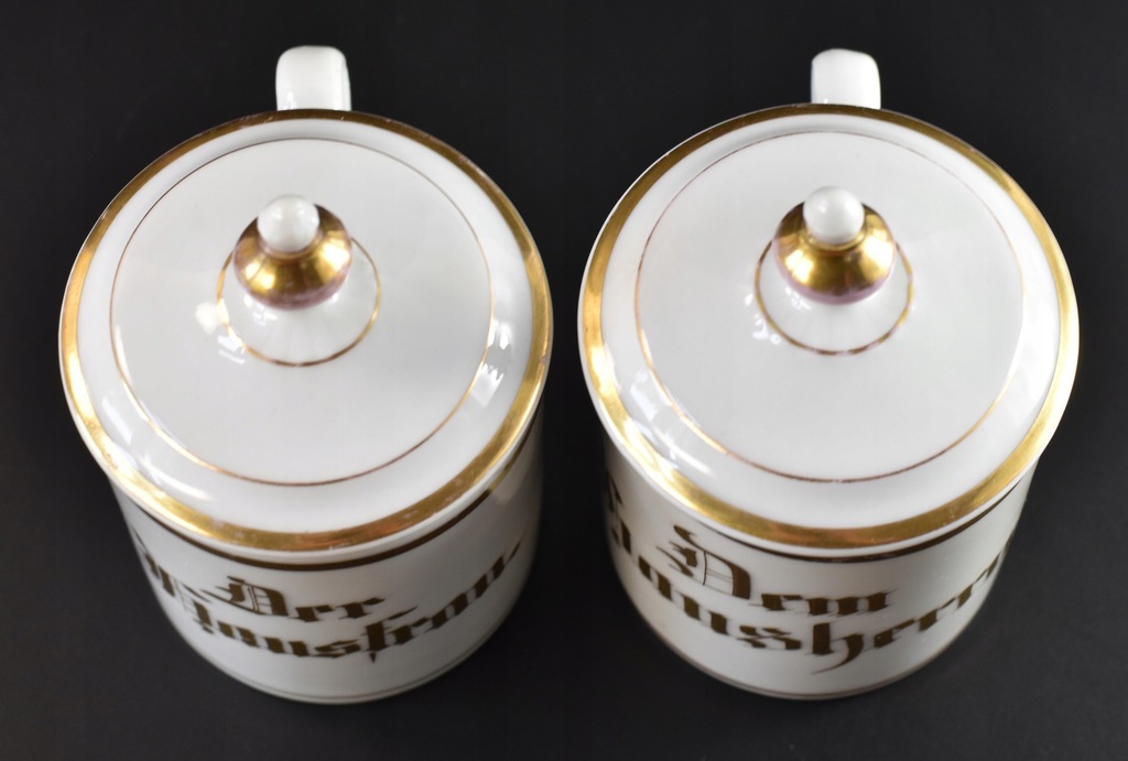 Para dużych kubków porcelanowych z przykrywkami. Porcelana pochodzi z manufaktury Carla Kristera, która znajdowała się dawniej w Wałbrzychu. Na kubkach widnieją dedykacje w jęzku niemieckim „Dem Hausherrn“ i „Der Hausfrau“, czyli dla pani i pana domu.