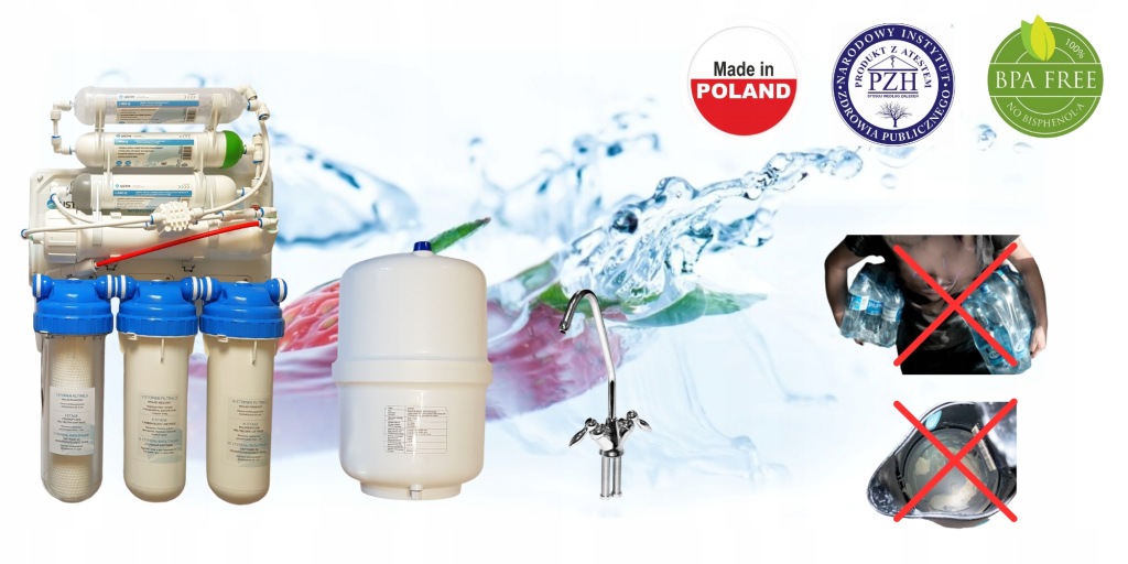 - są produkowane w Polsce - nasze zestawy filtrów RO posiadają informację "Made in Poland" gdyż większość części znajdujących się w naszych zestawach filtrów RO jest produkowana w Polsce (korpusy, obudowy filtrów, wkłady filtrów itp.), pozostałe mniej znaczące elementy są sprowadzane z zagranicy i tak jak części polskie posiadają certyfikaty PZH (Państwowy Zakład Higieny),