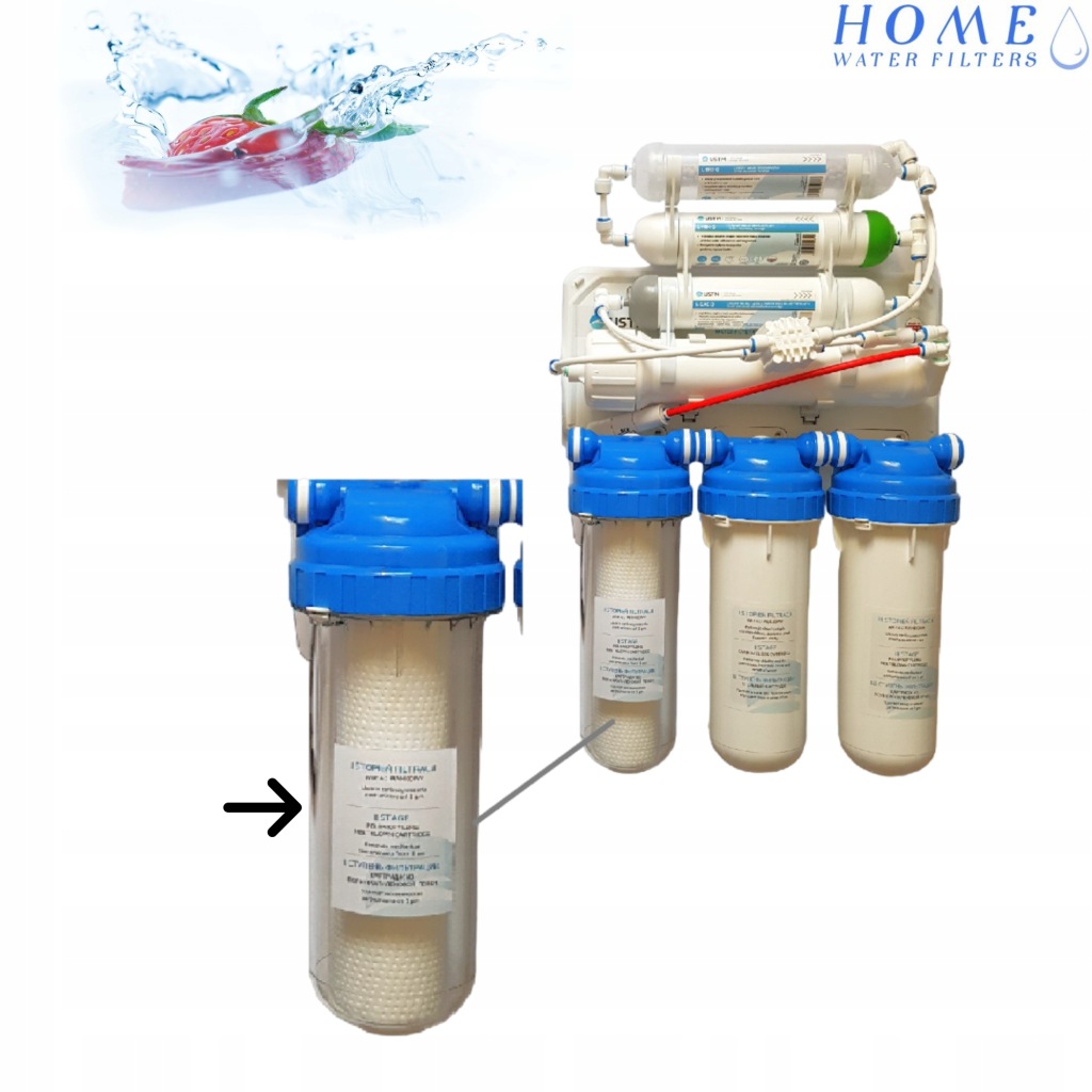 1-szy stopień: PS5 - filtr (wkład) piankowy mechaniczny wykonany z włókniny polipropylenowej usuwa większe nie rozpuszczone w wodzie zanieczyszczenia stałe takie jak rdzę, piasek, muł, itp. do wielkości 5 mikronów (5µm).