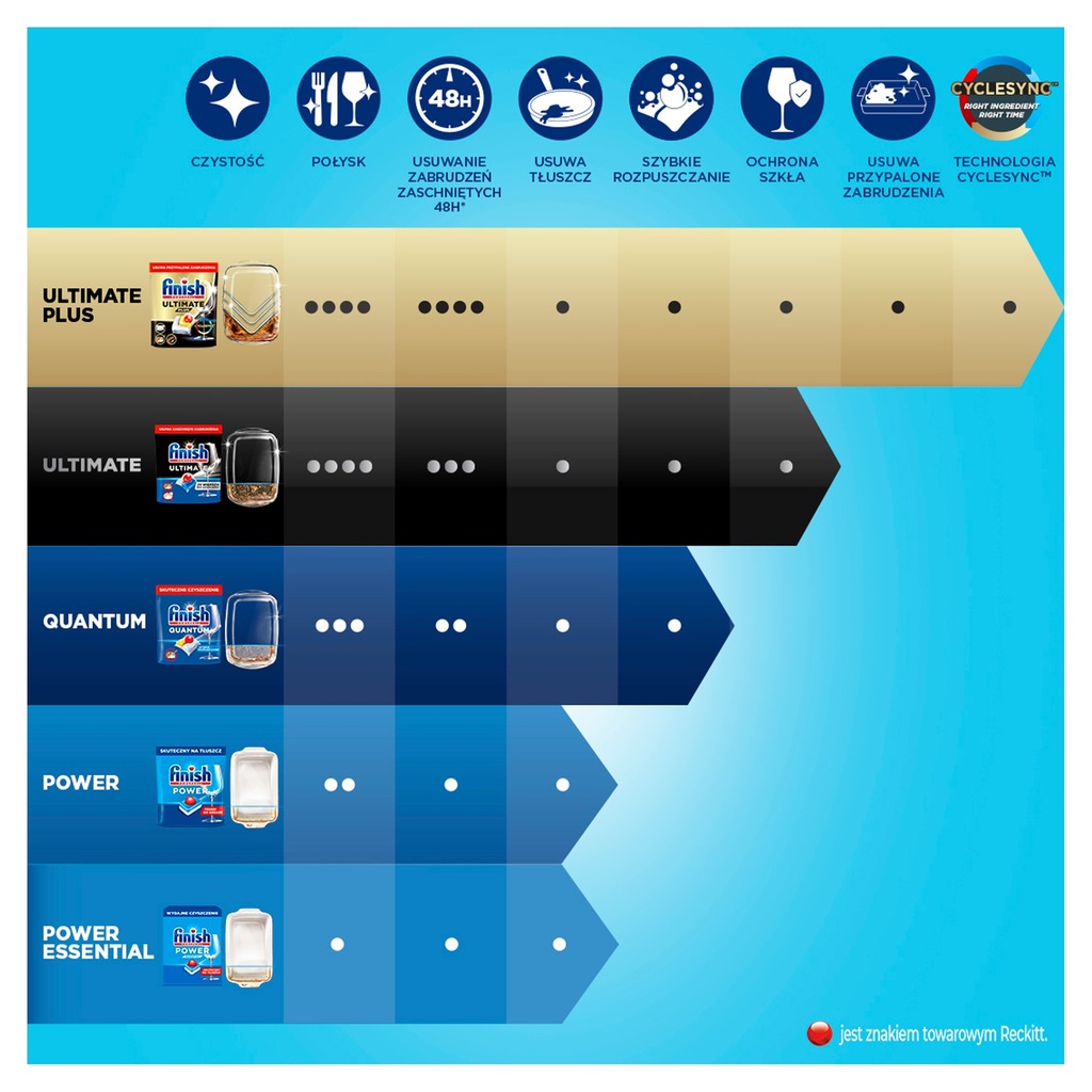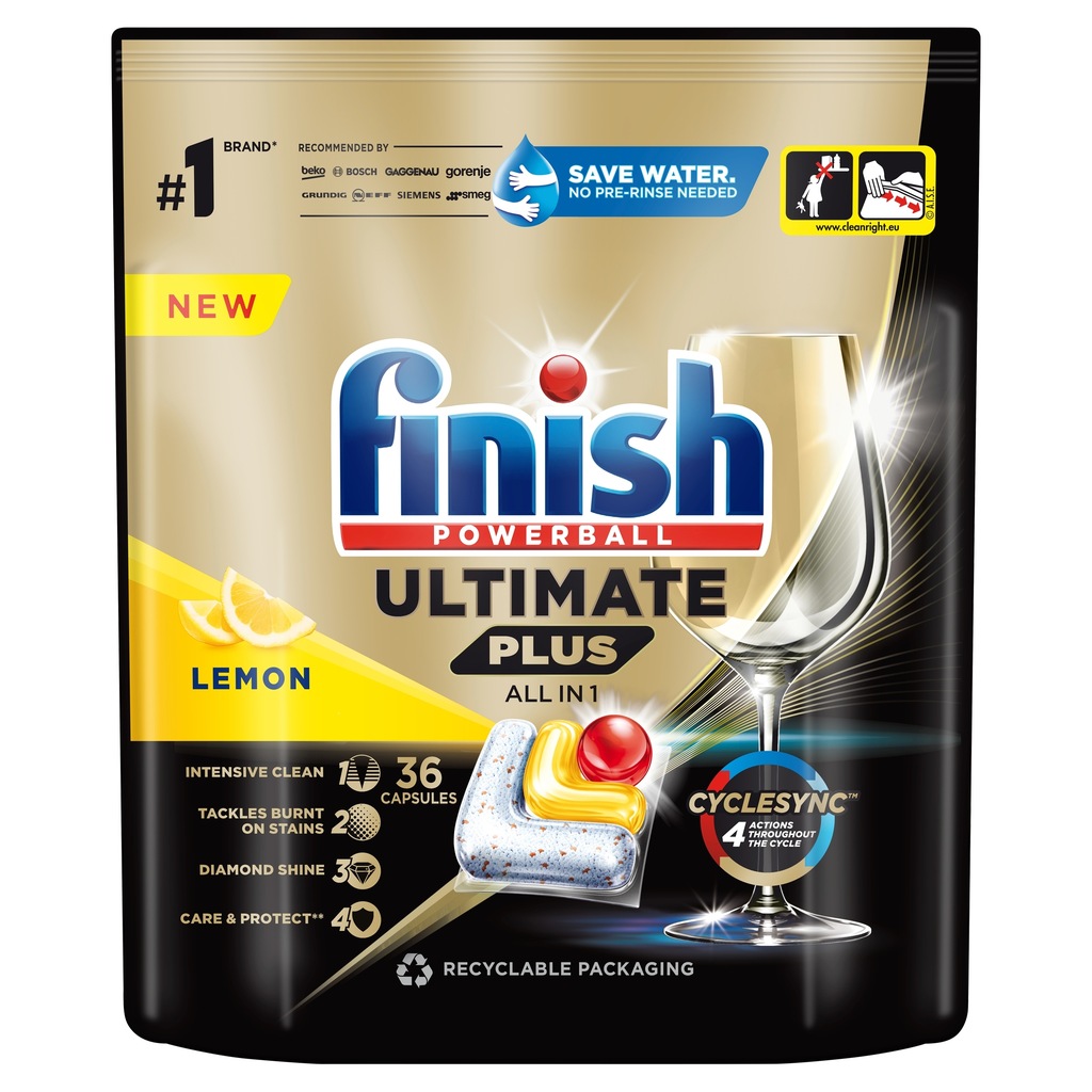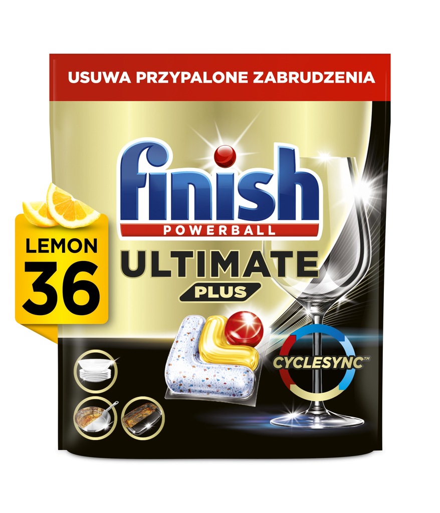 Finish Ultimate Plus Lemon to przełomowa innowacja wśród produktów do zmywania w zmywarce, która gwarantuje najlepsze efekty zmywania. To nasza pierwsza 3 komorowa kapsułka z technologią CYCLESYNC™, która pozwala na stopniowe uwalnianie właściwego składnika, we właściwym czasie w cyklu zmywania.