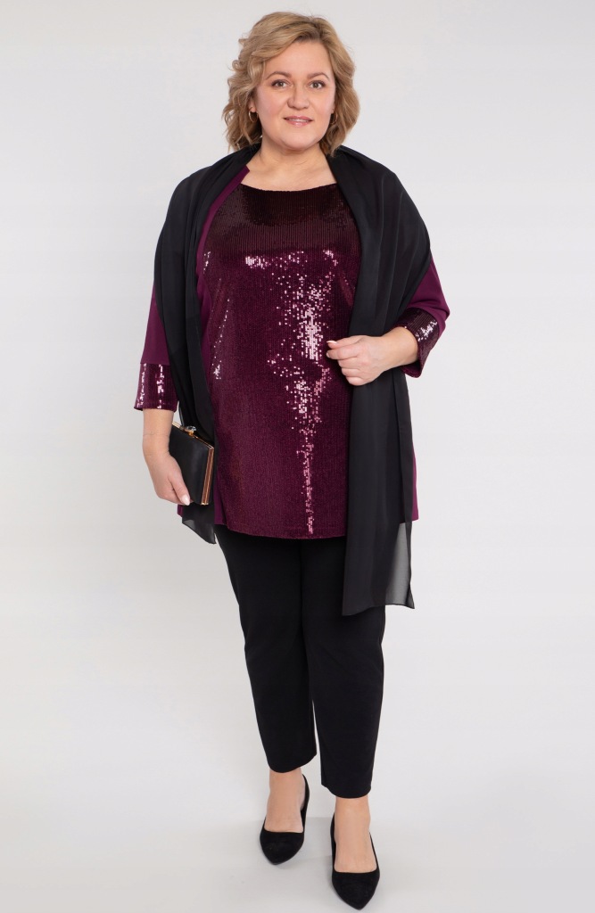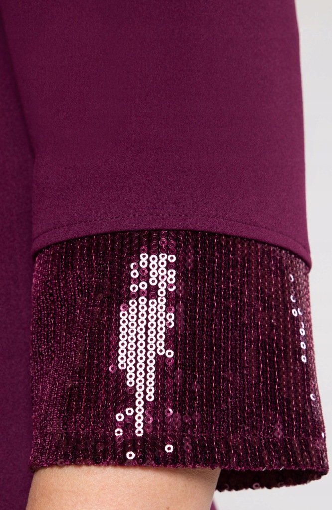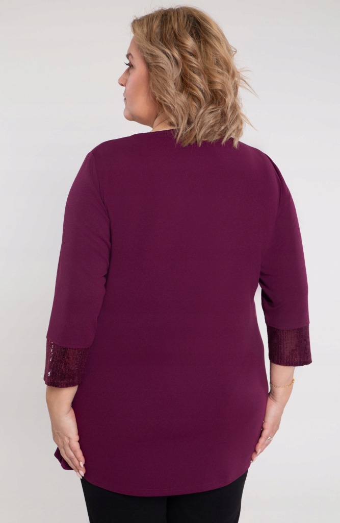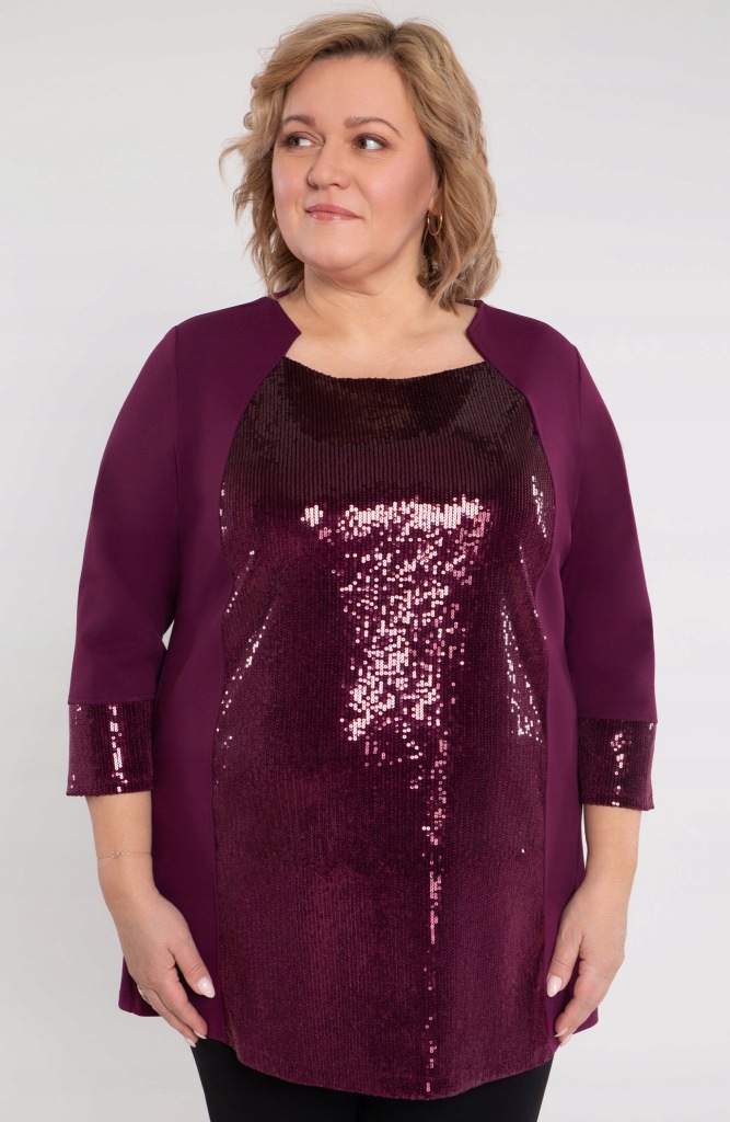 Tunika w fioletowym kolorze z przodem ozdobionym błyszczącymi cekinami, idealnie łącząca elegancję z wygodą. Rękawy o długości 3/4 zostały wykończone cekinowymi wstawkami, dodając całości spójnego charakteru. Wykonana z przyjemnego w dotyku materiału, zapewnia komfort noszenia i doskonałe dopasowanie do sylwetki.