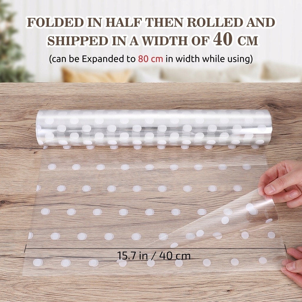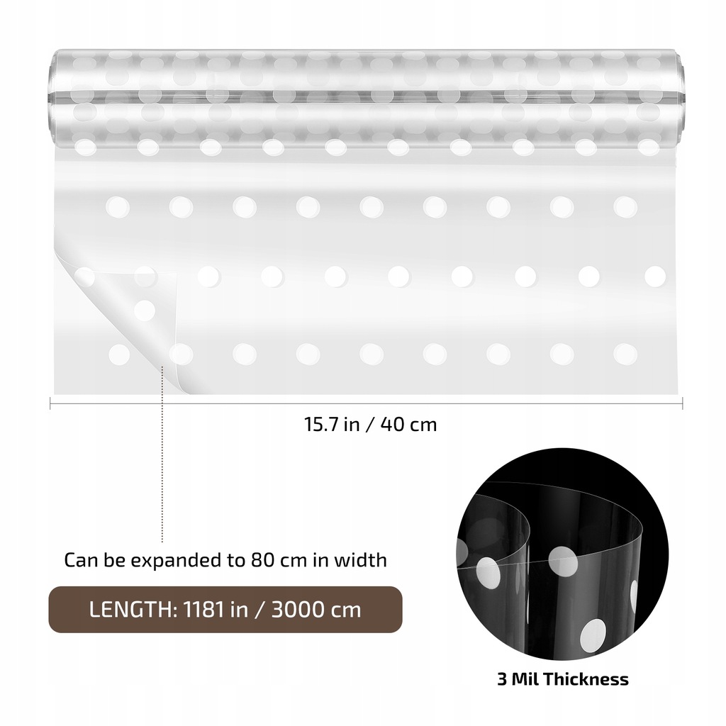 Nasza folia celofanowa z wzorem w białe kropki, modna i świąteczna, składana na pół, a następnie zwijana i wysyłana w szerokości 40 cm, z możliwością rozszerzenia do 80 cm szerokości, aby sprostać potrzebom pakowania większych przedmiotów.
