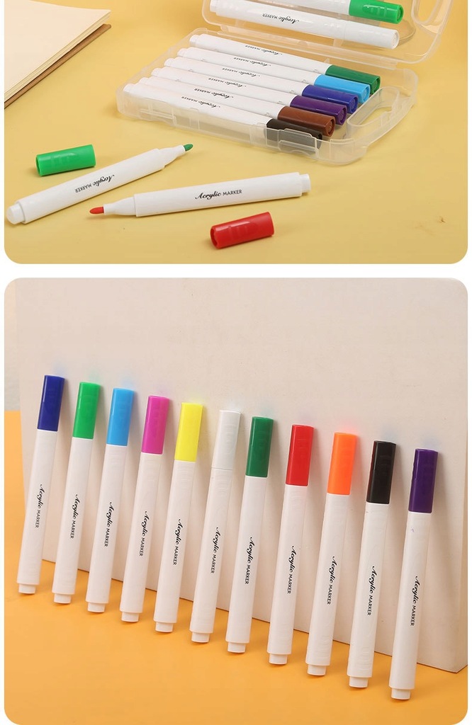 - Wodoodporna farba akrylowa. Nasze markery akrylowe są wykonane z wysokiej jakości tuszu na bazie wody o wysokiej czystości kolorów, są bezpieczne i wodoodporne, odporne na wysokie temperatury, szybko schną i utrzymują się przez długi czas, dzięki czemu twórczość artystyczna staje się radością.