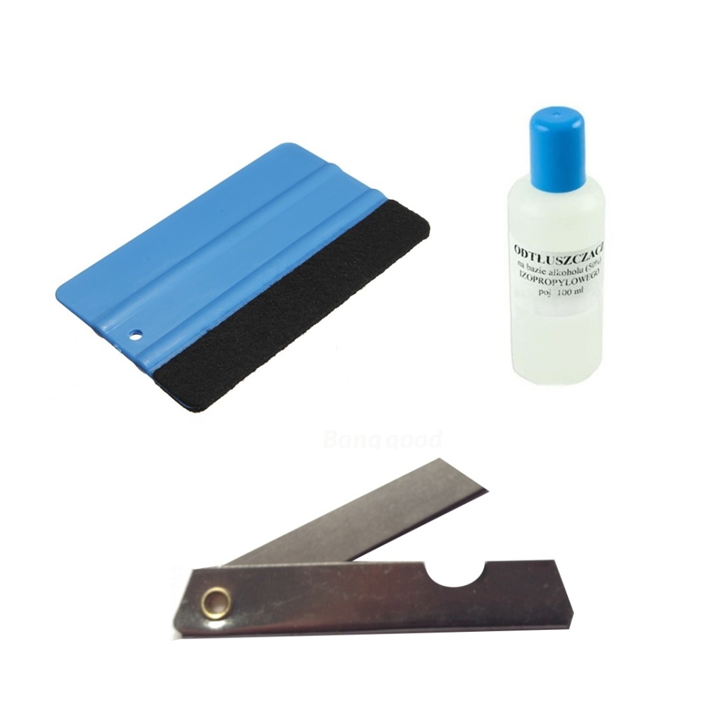 - Do przyklejenia folii przydatny będzie ostry nożyk, suszarka lub opalarka, benzyna ekstrakcyjna lub inny preparat do odtłuszczania powierzchni oraz rakla.