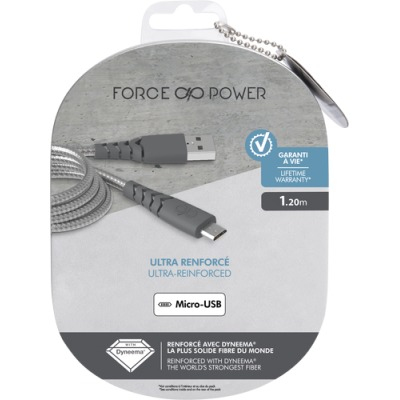 Wzmocniony kabel FORCE POWER gwarantuje ekstremalną odporność. TechnologyDyneema- powłoka 15 razy silniejsza niż stal, która oferuje wytrzymałość trakcji do 50 kg. Posiada wewnętrzny metalowy metalowy hak, który zapobiega wyciąganiu złącza a warstwa Vectran chroni przed szokiem elektrostatycznym.