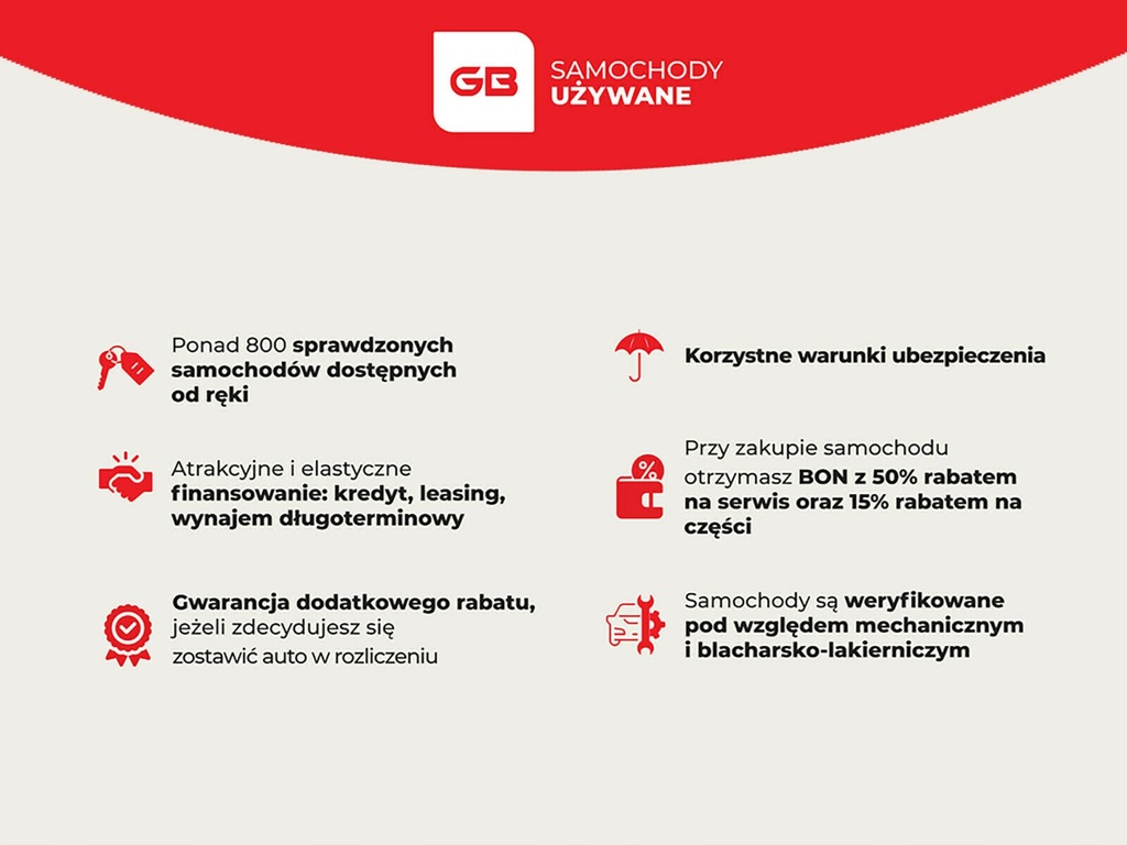 Poniższy samochód pochodzi z oferty GB Samochody Używane. W ramach Grupy Bemo możesz wybierać spośród starannie wyselekcjonowanego portfolio blisko 1000 samochodów używanych, mając pewność:
