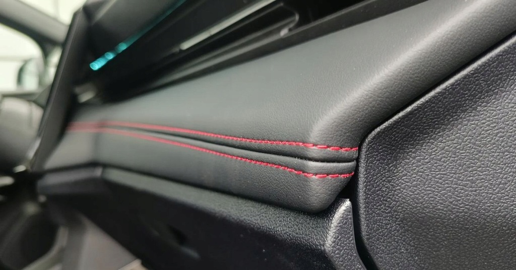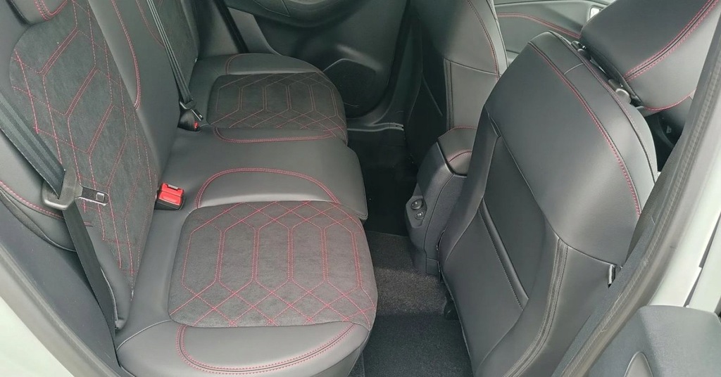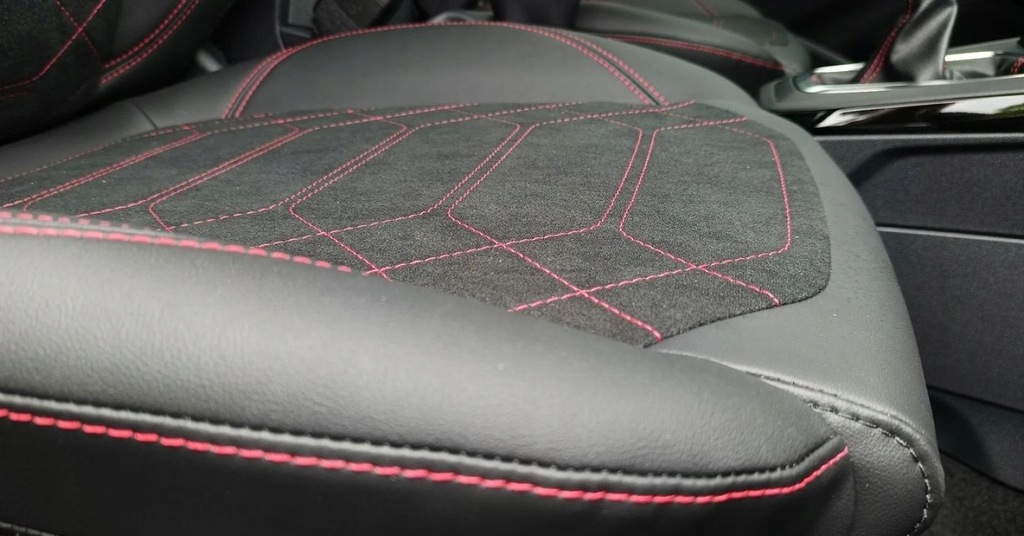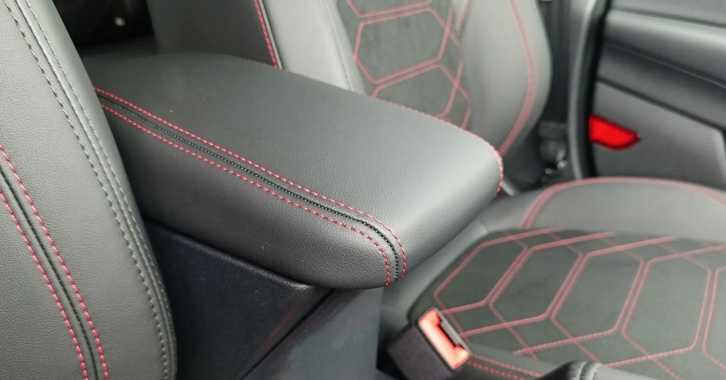 Przednie fotele – z tapicerką Neosuede/Vinyl z elementami skóry ekologicznej w ciemnej tonacji, z przeszyciami w kolorze czerwonym, styl sportowy