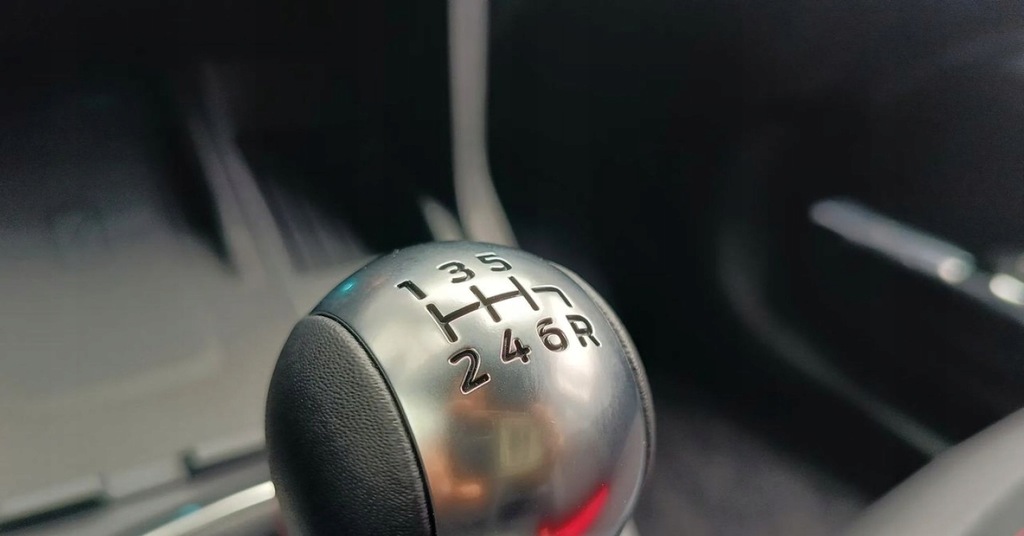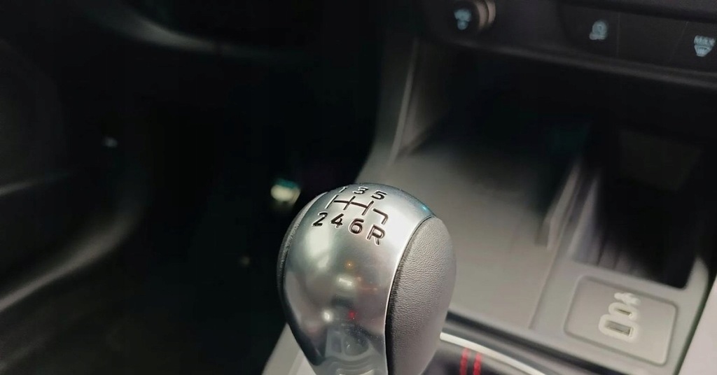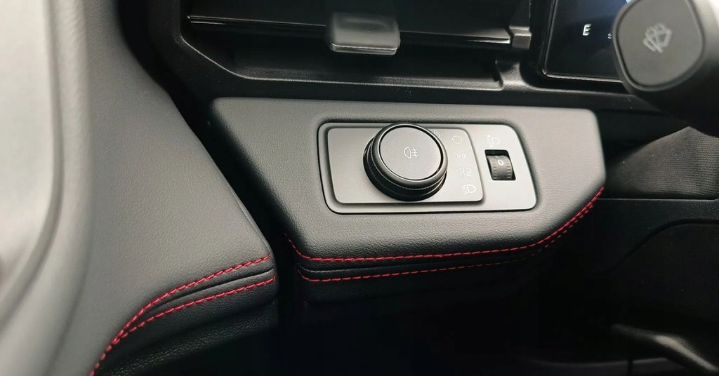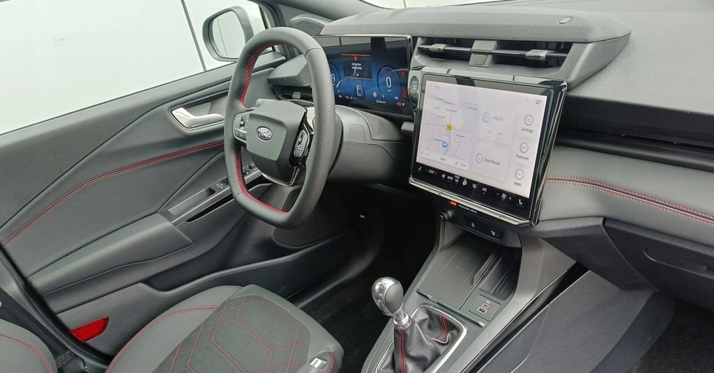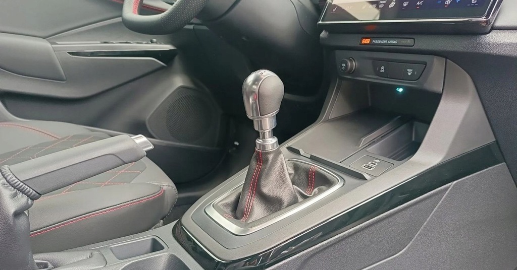 Uchwyt manualnej dźwigni zmiany biegów – wykończony skórą ekologiczną Sensico, w stylizacji ST-Line, z czerwonymi przeszyciami