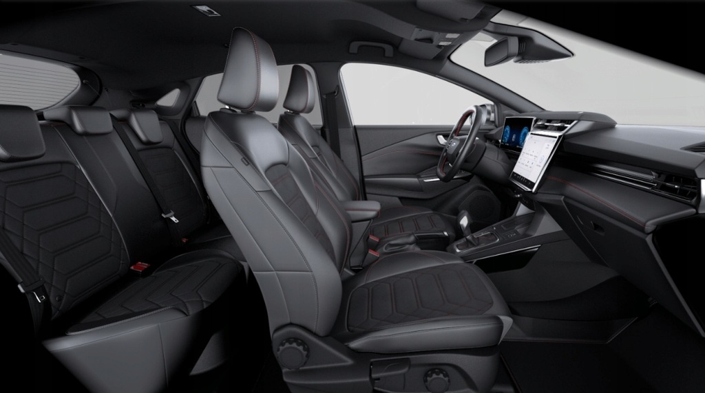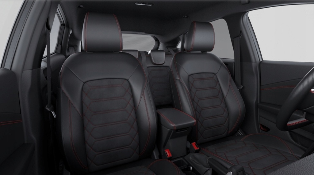 * Przednie fotele - z tapicerką z elementami skóry ekologicznej w ciemnej tonacji, z przeszyciami w