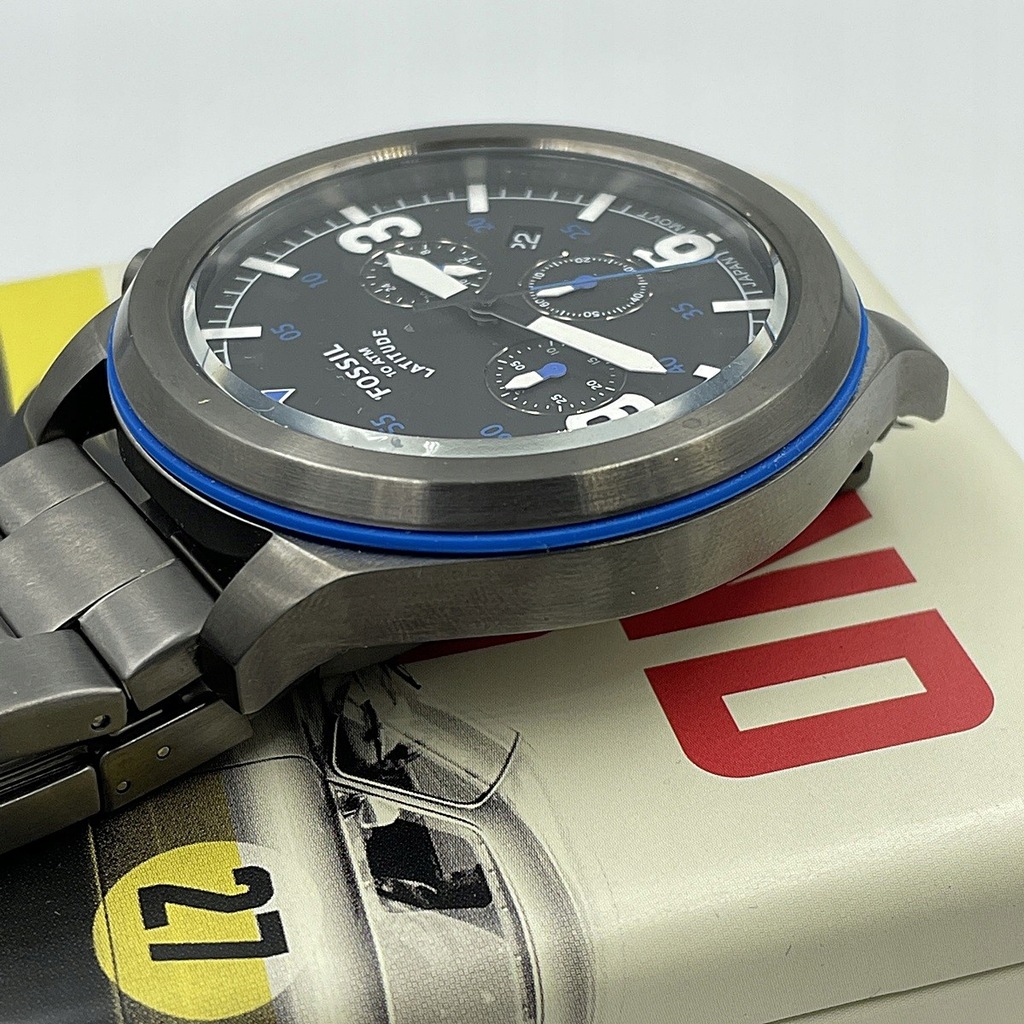 Fossil FS5753 to masywny męski zegarek z grafitową kopertą, grafitową bransoletą i czarną tarczą, należący do kolekcji znanej i cenionej marki na rynku fashion - amerykańskiego producenta najmodniejszych akcesoriów - FOSSIL. Ten zegarek męski nie tylko będzie niezawodnie wskazywał czas, ale też będzie stylowym dodatkiem do każdej stylizacji. Jak wszystkie w kolekcji zegarki Fossil Latitude, model o symbolu FS5753 jest połączeniem designerskiego stylu z wysokiej jakości materiałami wykonania. Koperta o szerokości 50.00 mm, której kształt jest okrągły, wykonana została z odpornej na uszkodzenia i korozję stali szlachetnej i ma kolor srebrny. Grubość koperty w tym modelu wynosi 13.00 mm, dzięki czemu idealnie będzie prezentował się na nadgarstku każdego nowoczesnego mężczyzny. Designerski charakter, jaki posiada ten zegarek Fossil FS5753 podkreśla idealnie dopasowana do koperty bransoleta, która ma kolor srebrny, o szerokości przy uszkach koperty 24.00 mm.
