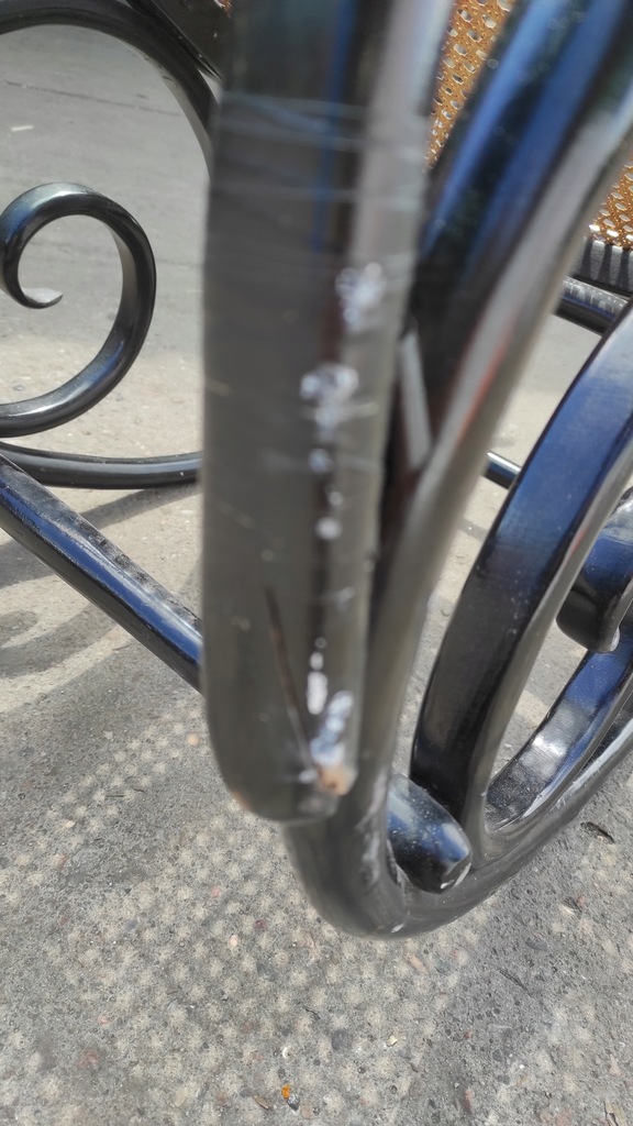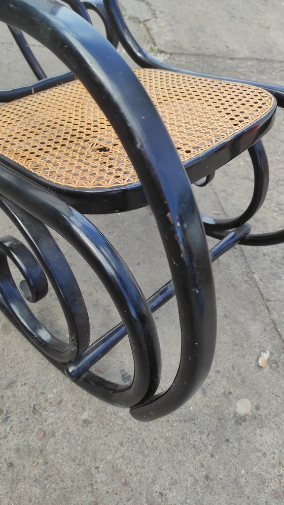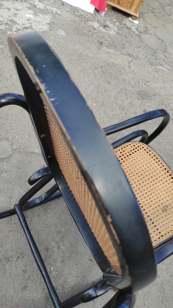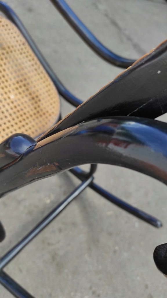 Fotel w kolorze czarnym. Z prawej strony widoczne jest pęknięcie - pokazane na ostatnim zdjęciu.