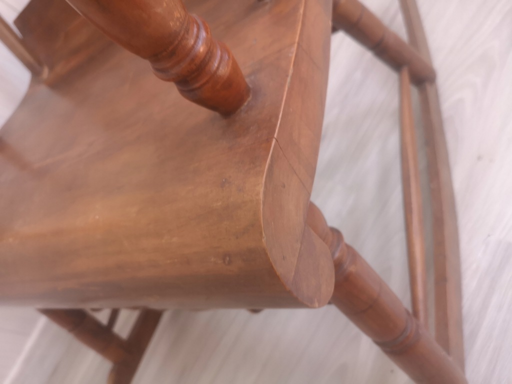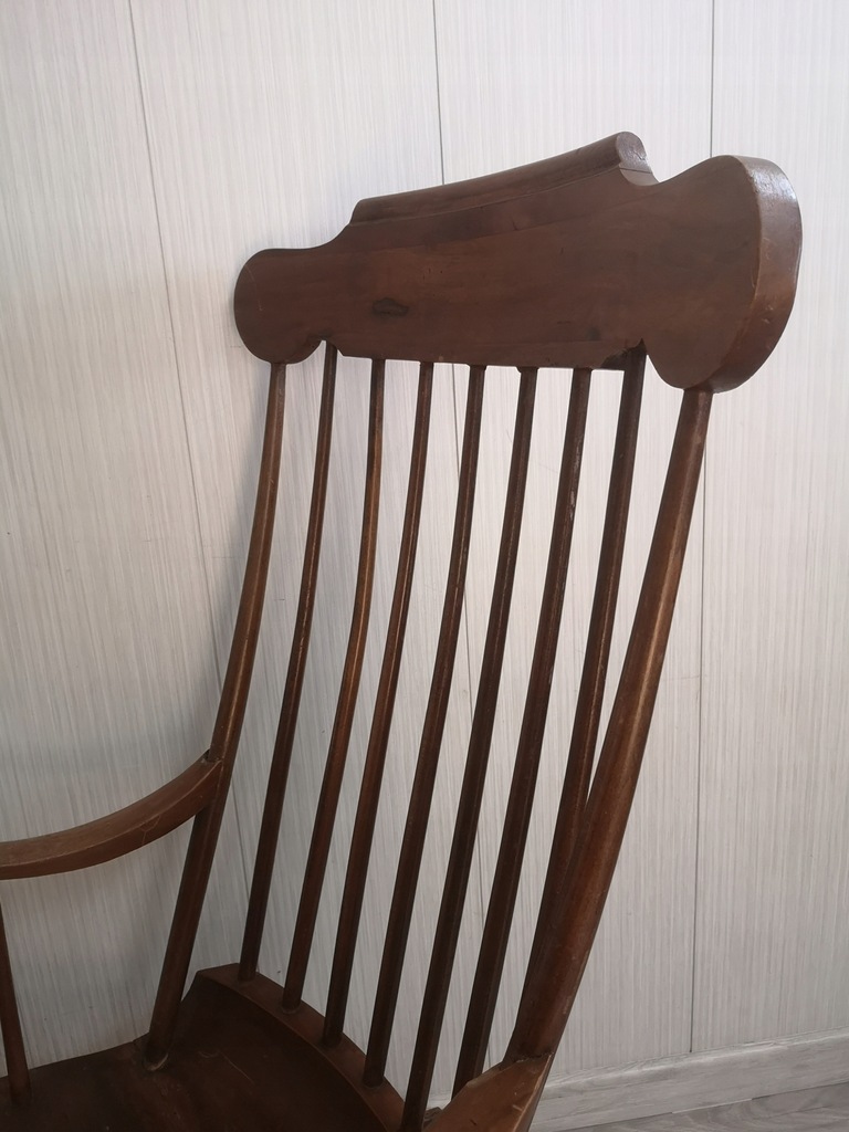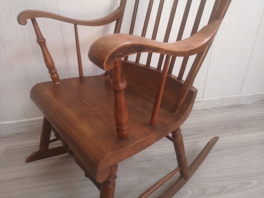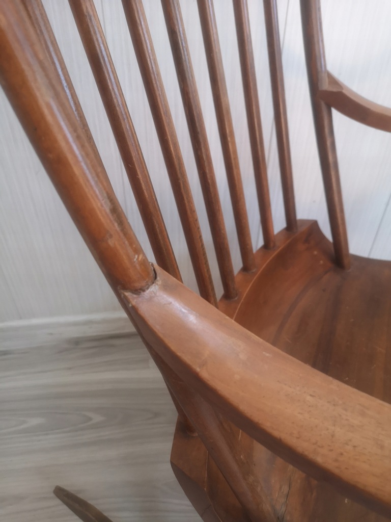drewno w dobrym stanie, zadrapania, ryski, ubytek na podłokietniku w miejscu łączenia z oparciem ale bez wpływu na stabilność,