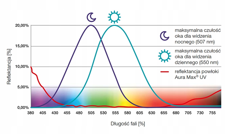 Aura Max UV charakteryzuje się niską intensywnością barwy odbicia resztkowego, co stanowi o jej delikatności i dużej estetyce. Niskie odbicie światła w szerokim zakresie światła widzialnego – na poziomie 0.3%, oznacza także doskonałe właściwości optyczne, duży kontrast i redukcję olśnień w zakresie widzenia dziennego i nocnego (wykres obok), zwłaszcza z uwzględnieniem długości fal, dla których czułość oka jest największa.