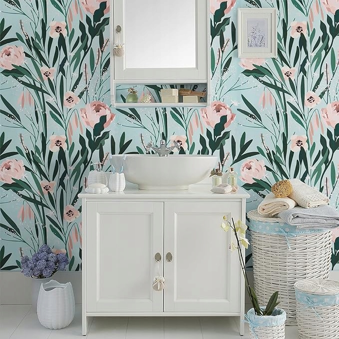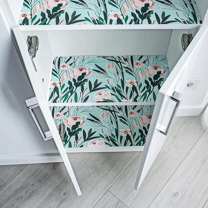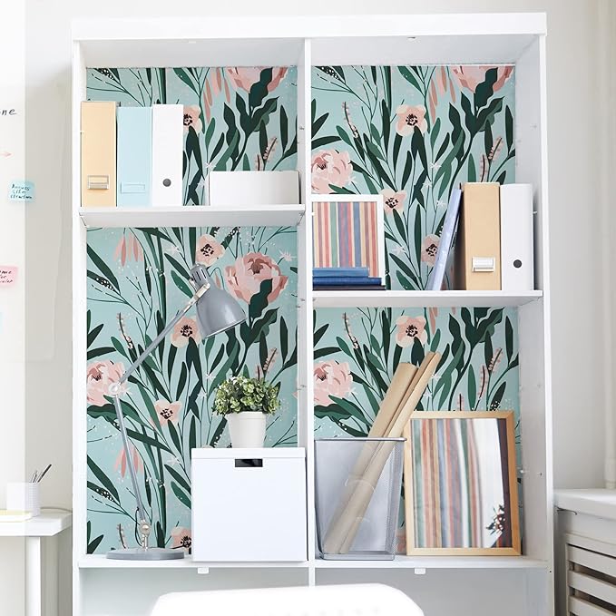 - Tapeta samoprzylepna: gruba tapeta w kwiaty, którą można odkleić i przykleić, nie wymaga dodatkowego kleju, jest wysokiej jakości i łatwa w montażu