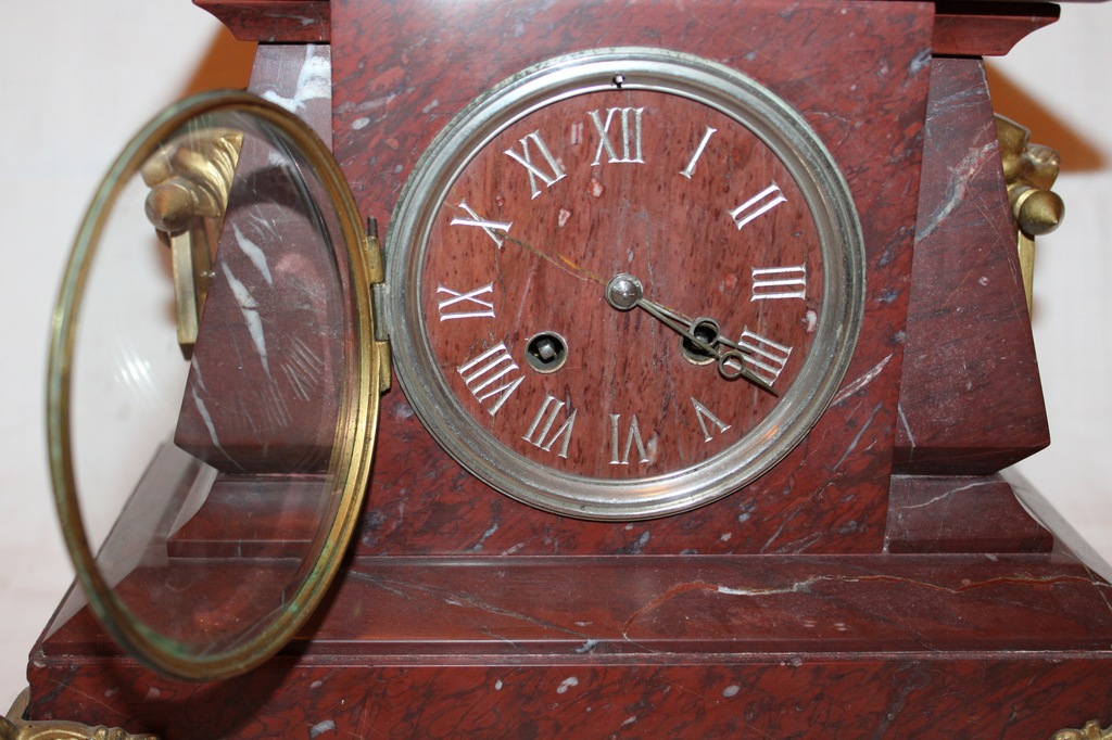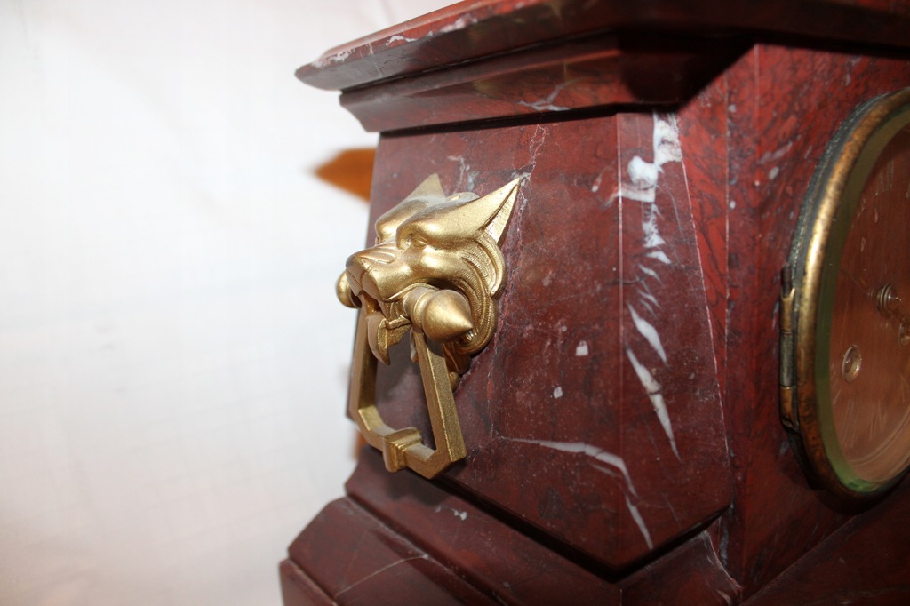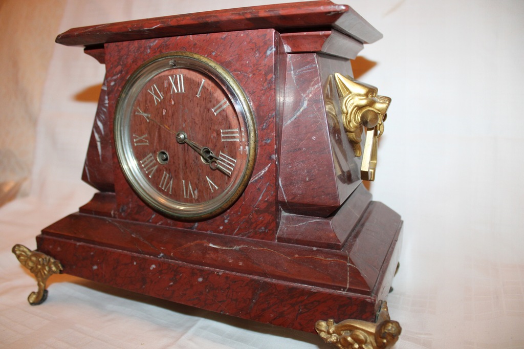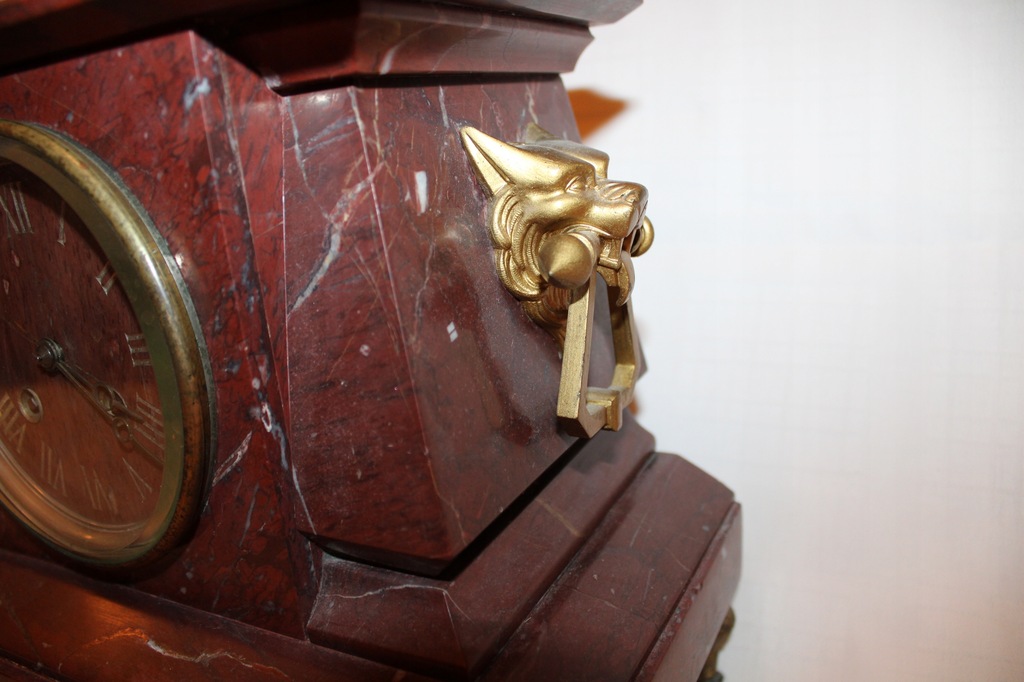 Francuski marmurowy zegar kominkowy, marki Japy Frères, XIX wiek. Wymiary podstawy 31 cm x 17 cm; wysokość 23 cm. Lewy górny narożnik ukruszony. Zegar wykonany z marmuru, z boków zdobiony głowami psa lub wilka trzymającymi w pyskach uchwyty. Średnica tarczy zegara 9,5 cm. Zegar sprawny, bije raz na połówki i określoną ilość razy na pełne godziny. Piękne, ciche brzmienie.