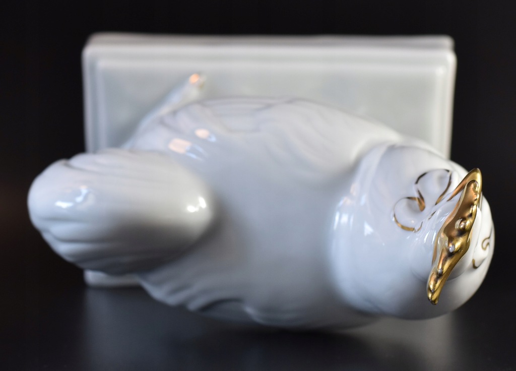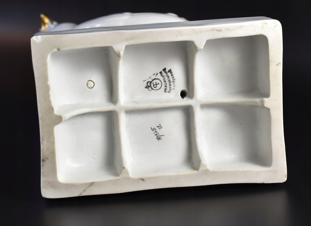 Stan: figurka jest w bardzo dobrym stanie z lekkimi śladami użytkowania / przetarciami złoceń; jeden minimalny odprysk w dolnej części podstawy oraz jeden płaski odprysk od spodu na podstawie (pokazane na zdjęciach).