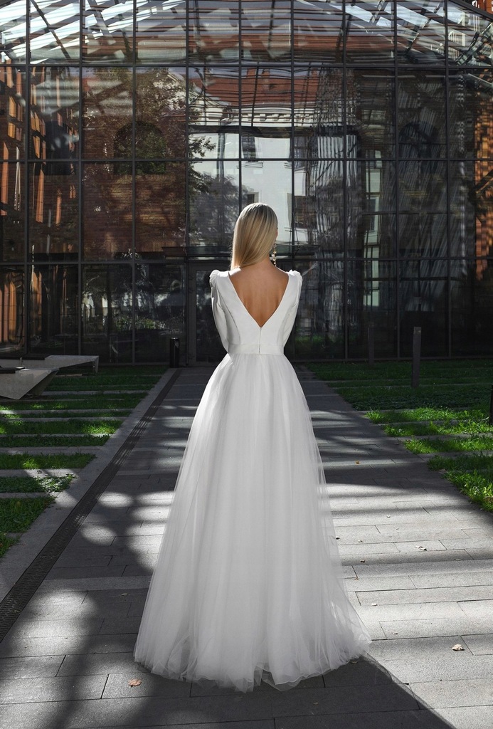 Fason sukni typu princessa, spódnica tiulowa, góra z satyny matowej, długie rękawy, zapięcie na zamek, suknia ma wszyte miski na biust r.B.